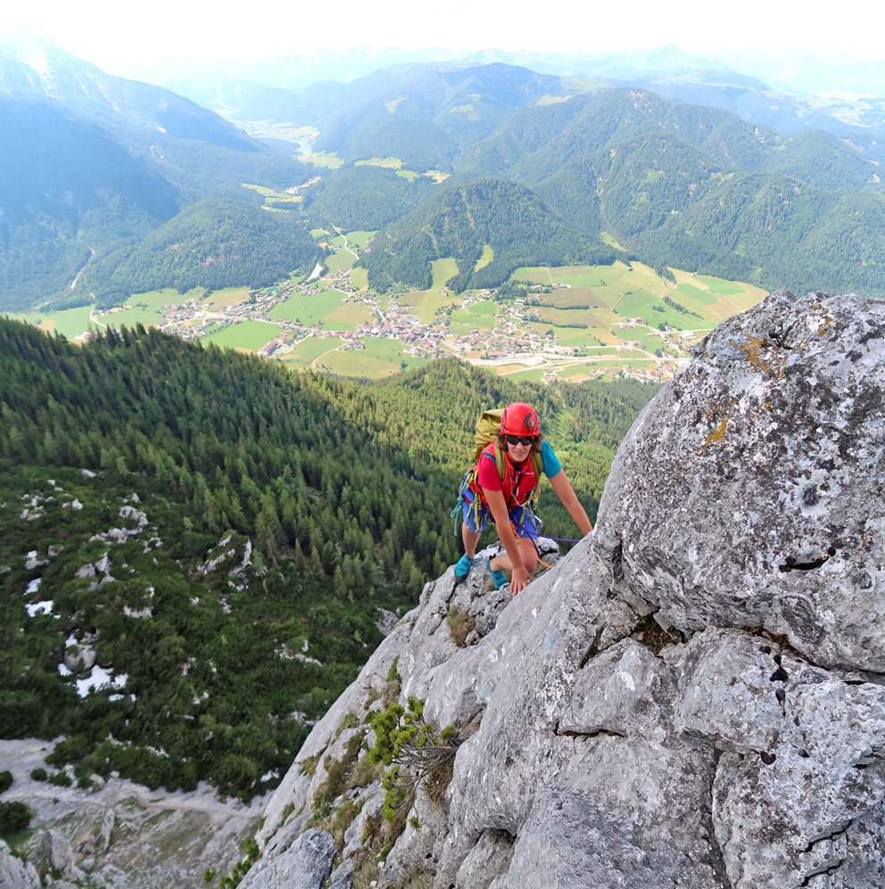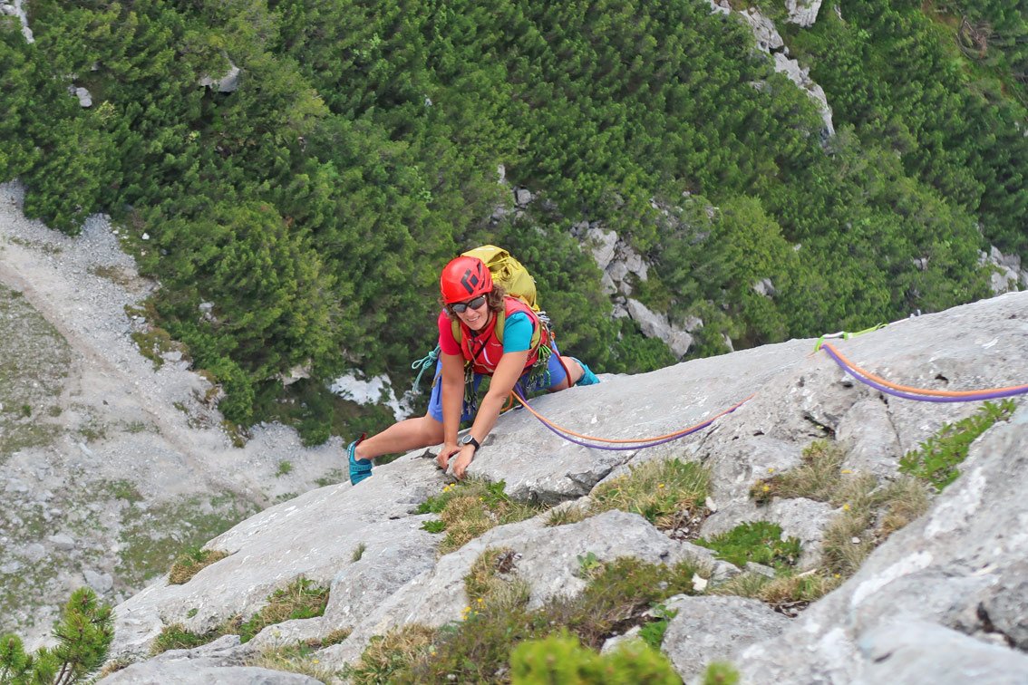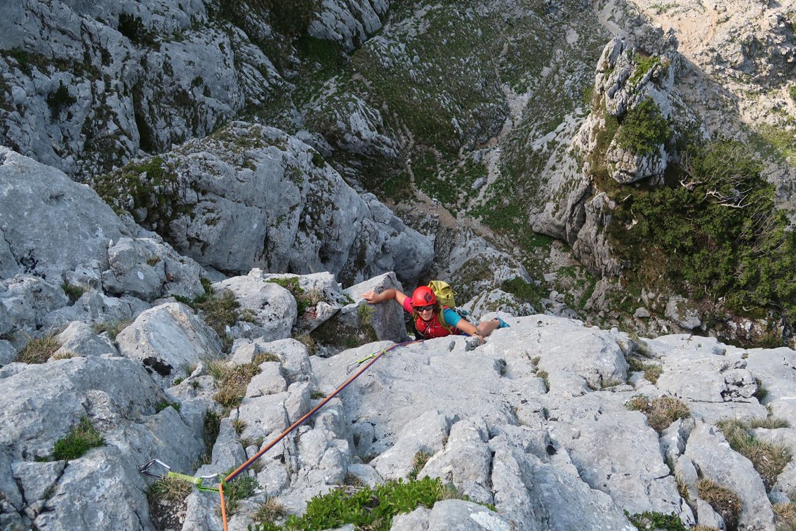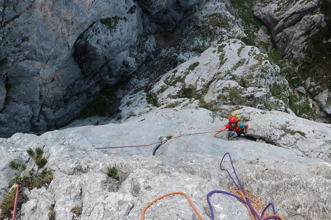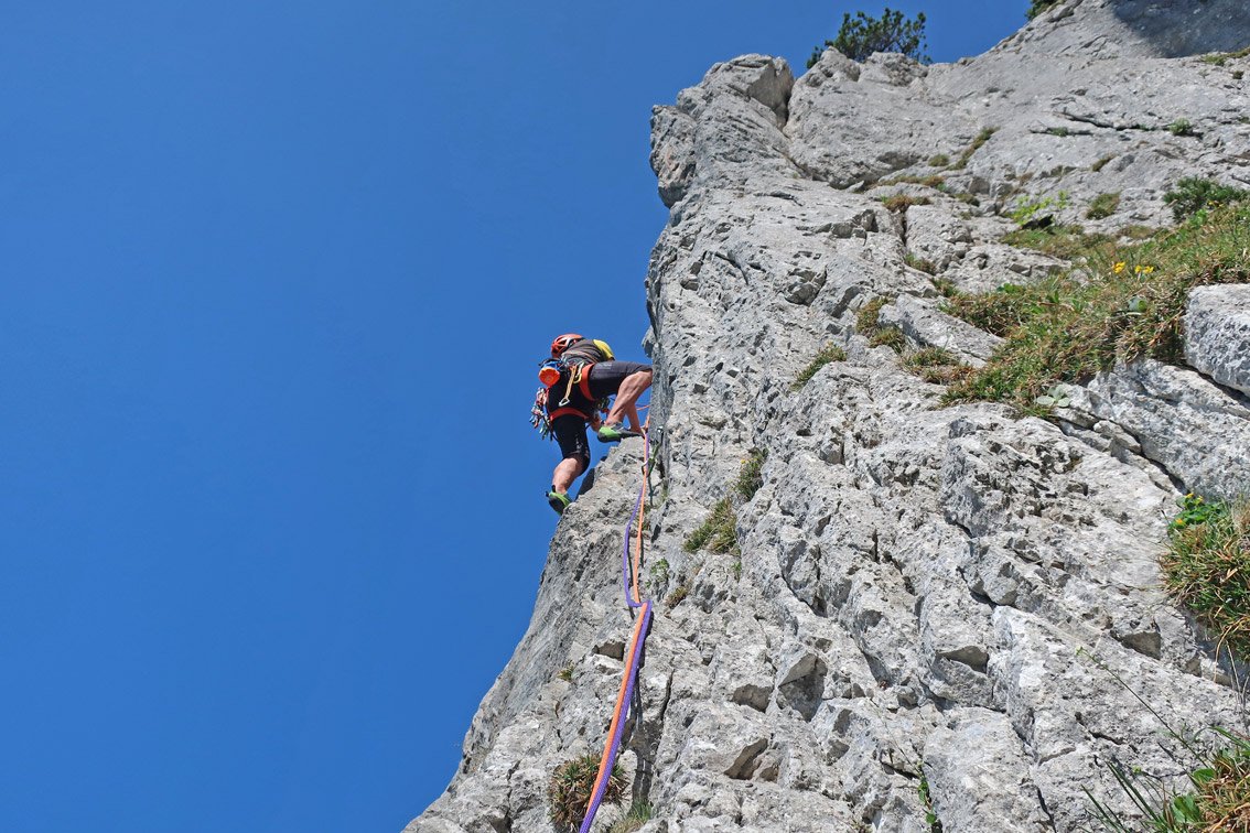 2 x 60 m Doppelseil, 13 Expressschlingen und Helm - Keile sind nicht nötig.