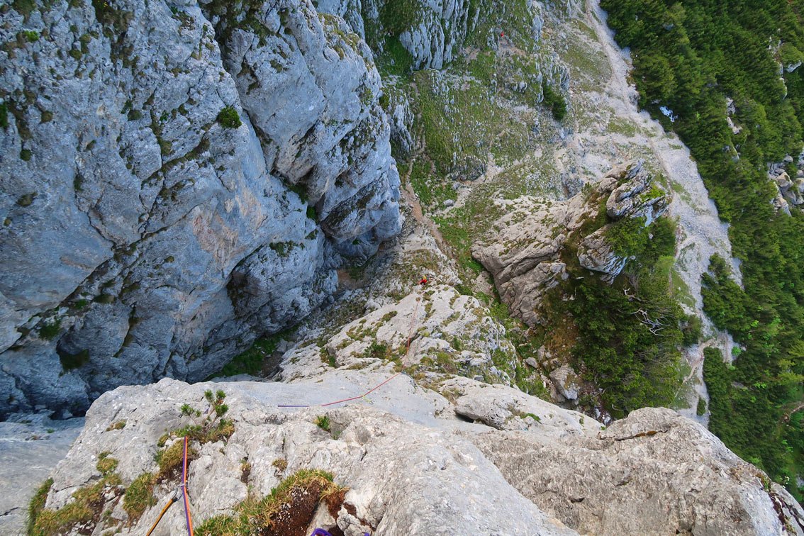 Vom Ausstieg nach rechts zur Grasrinne und zum sog. Plattenkamin (markante Rinne, die zum Einstieg hinunterführt). In der Rinne abseilen - siehe Topo. Bei trockenen Verhältnissen kann man in der Grasrinne hinunterklettern - Stellen l und kommt zum zweiten Abseilstandplatz (siehe Topo). Dann im Plattenkamin 2 x mit Doppelseil zum Einstieg abseilen.