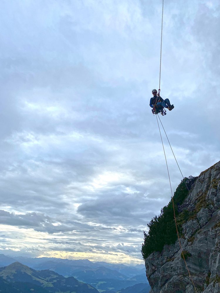 Bis zum Einstieg der Tour abseilen und anschließend 3x60m über "Via Romantica" bis zum Boden abseilen. Alternativ kann man die Route "Gemini" bis nach oben klettern (siehe Topo Gemini) und vom Gipfel der Kopfkraxen auf dem markierten Normalweg (Wiesberg) hinunter. Unten, nach einer Latschenzone nach links zum Wasserfall und weiter ins Tal.