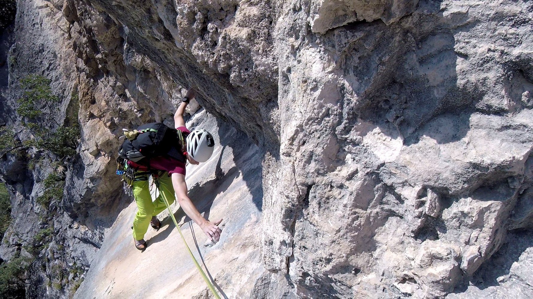 Die Tour ist mit Bohrhaken und vielen Sanduhren recht gut abgesichert. Evtl. ist einmal ein kleinerer Cam nützlich, aber nicht unbedingt notwendig.