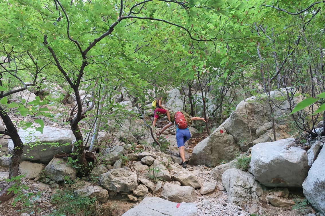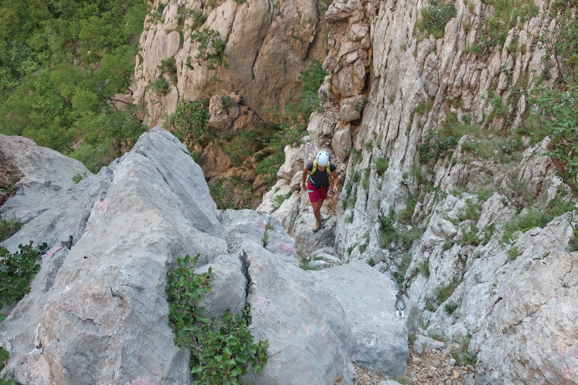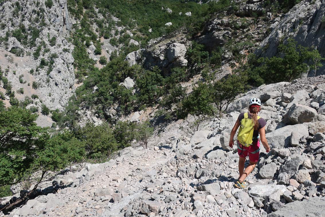 Beim Abstieg kann man im großen Schuttfeld entweder gerade hinunter (schwach markiert) und dann einen steilen Klettersteig absteigen (Steinschlaggefahr; steile Seilpassagen) oder man quert unter die Ausläufer des Anica Kuks und steigt dort auf einem Pfad gemütlich hinunter zum Schluchtweg.