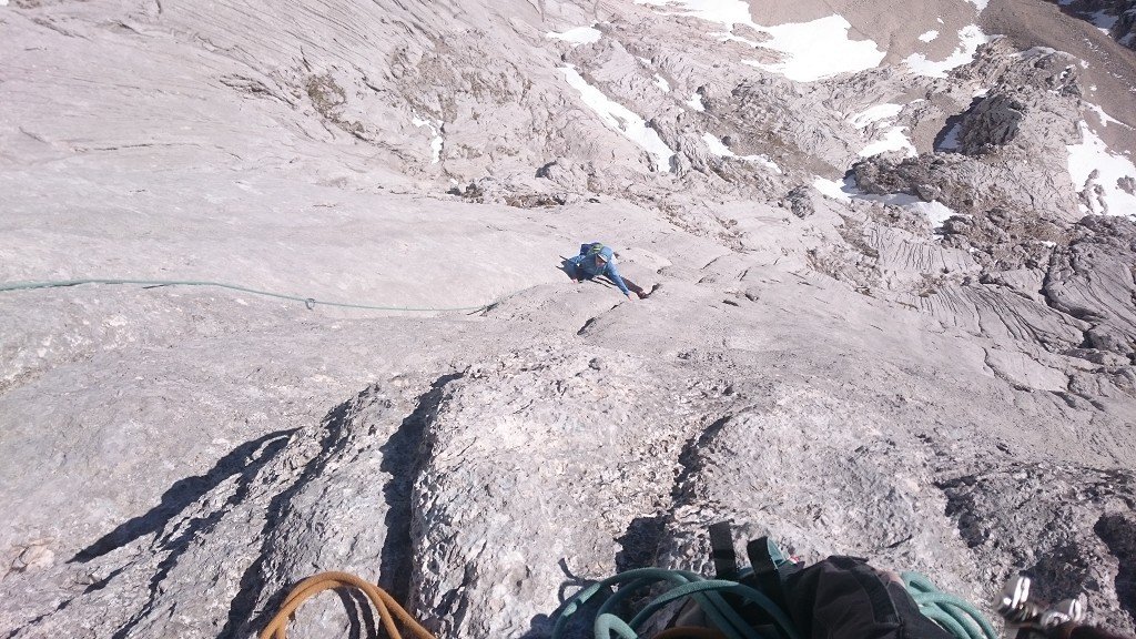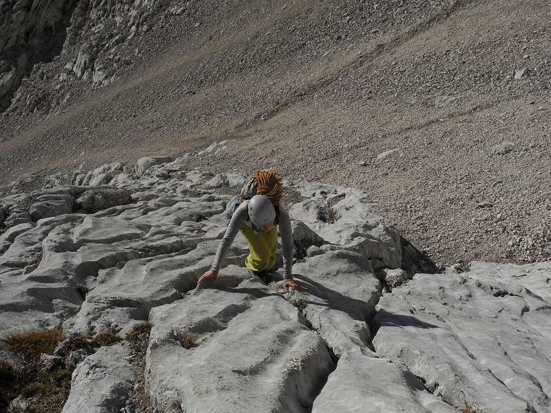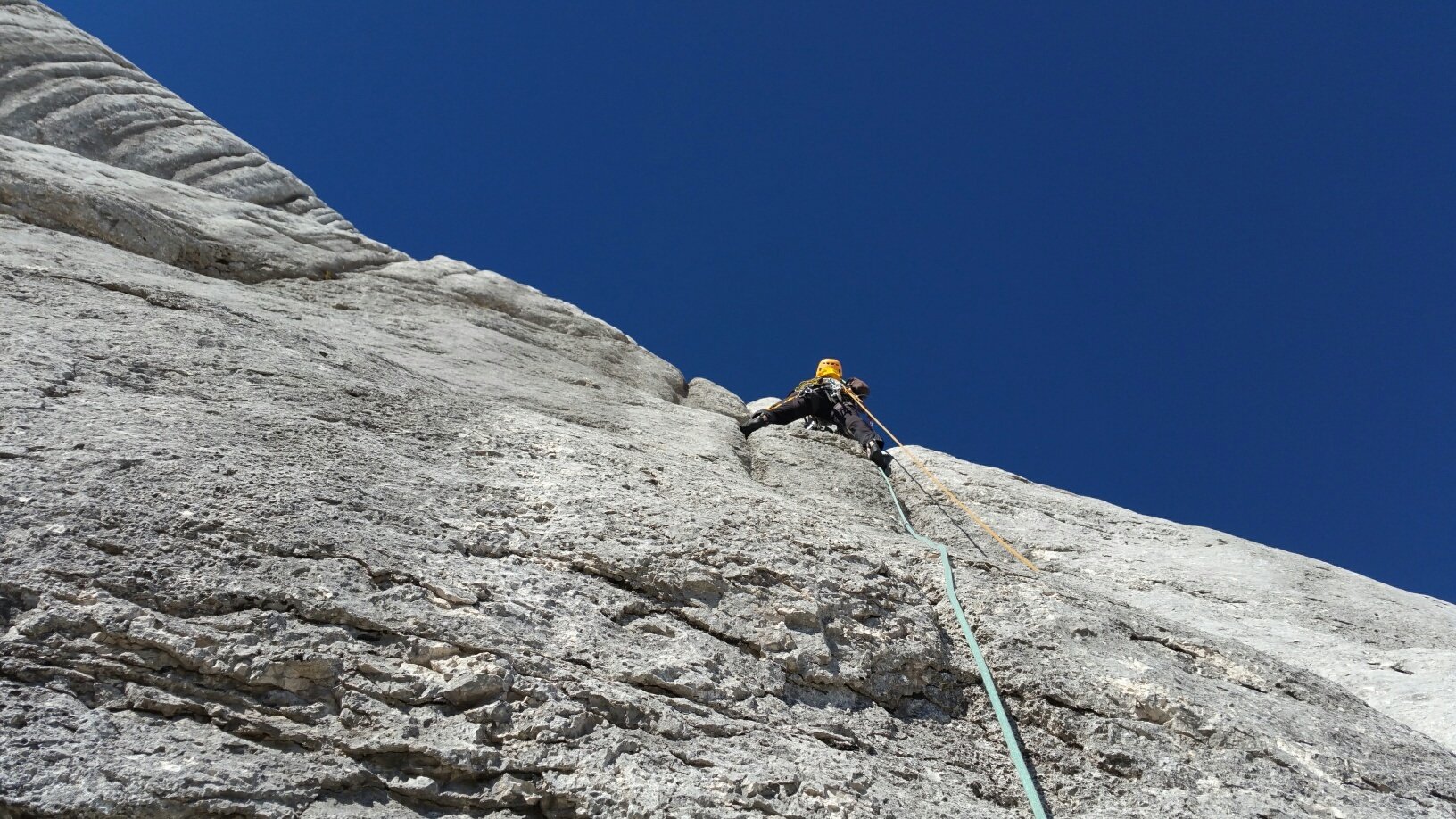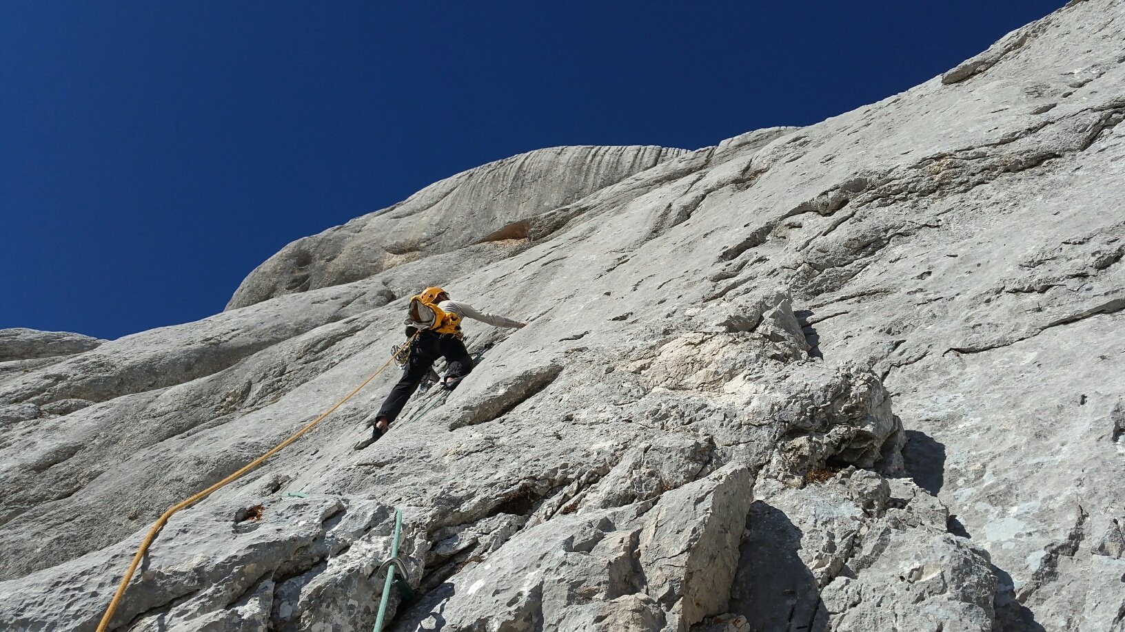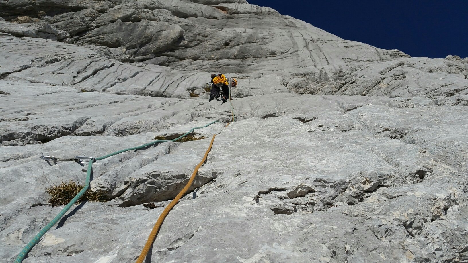 Die Tour selbst trägt ihren Namen, weil Bohrhaken in slowenischen Gebirgen sehr kritisch beäugt werden. Wenn sie noch dazu von einem Deutschen gesetzt werden, grenzt das ja fast an einen Skandal J. Ein Skandal wäre es jedoch auch, diese superkompakte markante Doppelwasserrille nicht zu klettern. Einfach fantastischer rauer Fels wartet auf Euch! Sie ist trotz einiger weniger Bohrhaken immer noch als alpin und keinesfalls als Sportklettertour einzustufen; der Schwierigkeitsgrad sollte schon beherrscht werden! Dennoch ist sie – bis auf vielleicht den Einstieg in die zweite Länge, der sich jedoch gut auflöst – mit dem angegebenen Material recht gut absicherbar.
