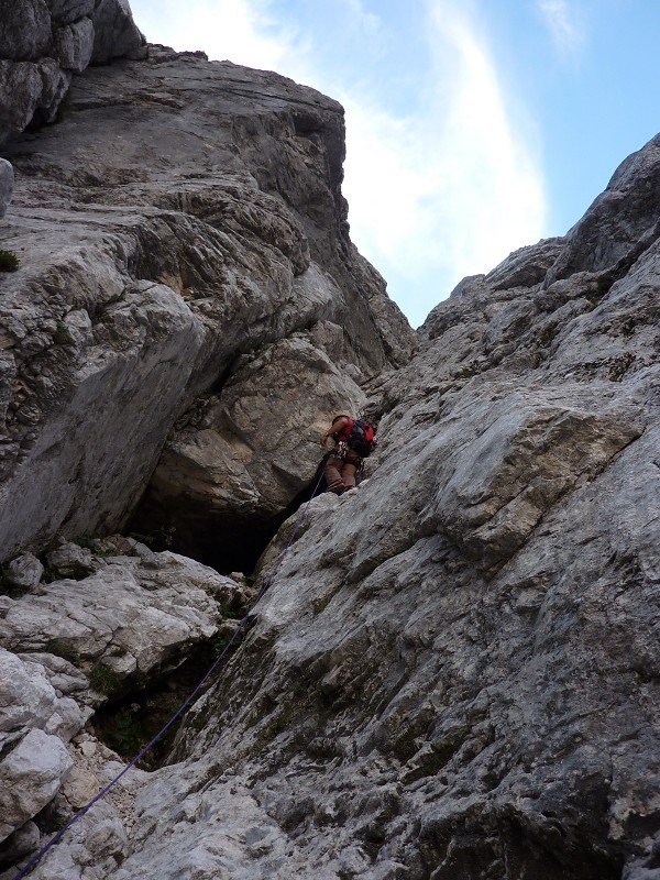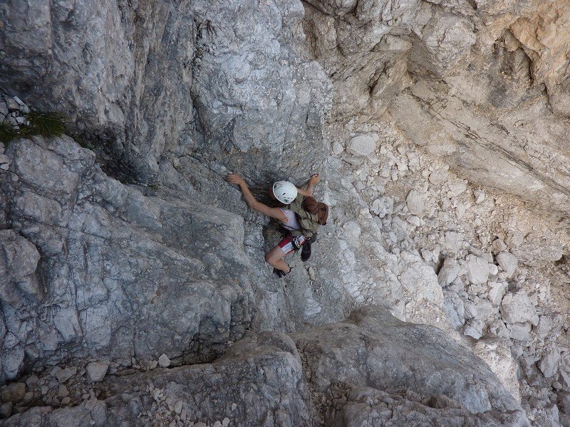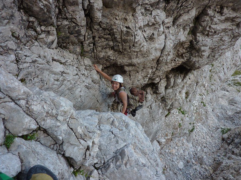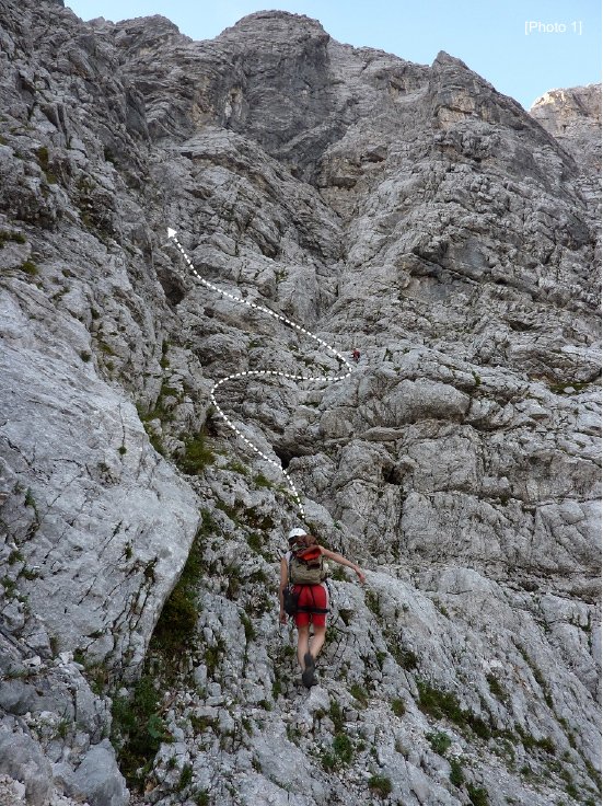 Der Slowenische Weg ist der leichteste und beliebteste Anstieg durch die Wand. Er führt zwar durch den linken, nicht ganz so hohen Wandteil und nicht auf den Gipfel, ist aber mit 800m Wandhöhe (Wegstrecke viel viel länger!) immer noch beachtlich hoch. Die Kletterei führt meist durch gutes Gestein, fordert jedoch aufgrund seiner Länge und Komplexität den ganzen Alpinisten. Wer hier alles sichern will wird ziemlich alt in der Route – und ist auch wegen des kompakten Gesteins gar nicht so leicht (deswegen Haken mitnehmen, falls man vorhat, mehr zu sichern).