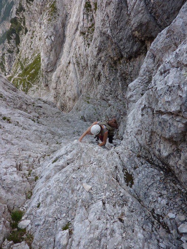 Am Ausstieg ein paar Meter absteigen und dann den großen Geröllkessel und über zwei Felsrücken immer mehr oder weniger waagrecht etwa nach Osten queren (weglos aber einfach). Nach etwa 30min trifft man auf den markierten Weg zum Triglavski Dom. Will man den Gipfel mitnehmen geht’s hier aufwärts zur Hütte und weiter über den Normalweg (Klettersteig) zum Gipfel (weitere 1,5-2h). Sonst geht’s auf dem markierten Pragweg abwärts immer Richtung „Aljazev Dom“. Nach der Klettersteig-Passage (B) gelangt man wieder zum Wandfuß. Von hier über den Aufstiegsweg zum Auto.