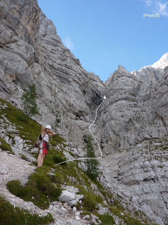 Vom Aljazev Dom (1015m) folgt man dem beschilderten Weg in südwestlicher Richtung taleinwärts. Nach etwa 25min zweigt links ein markierter Steig ab Richtung „Pragweg“. Diesem folgt man bis direkt unter die Wand (kurz mit Drahtseilen gesichert). Kurz hinter einigen Gedenktafeln gelangt man zu einer kleinen geröllbedeckten Schlucht. Hier verlässt man den markierten Weg und steigt über einen kleinen aber deutlichen Steig – zuletzt über einen Graskamm – bis zum Einstieg.