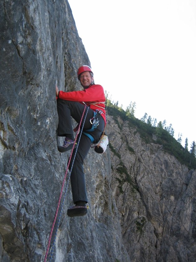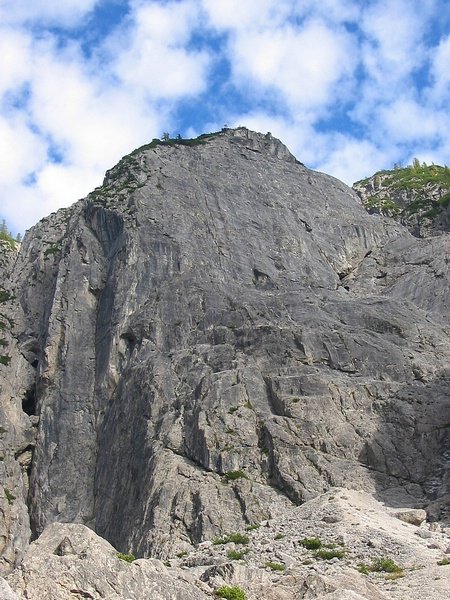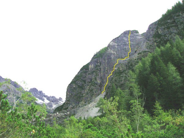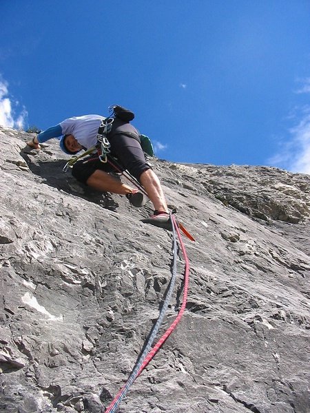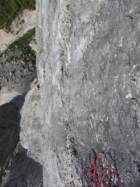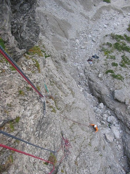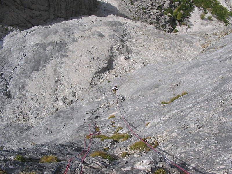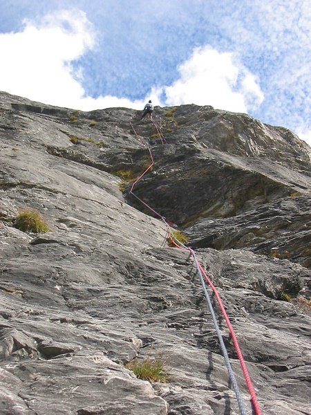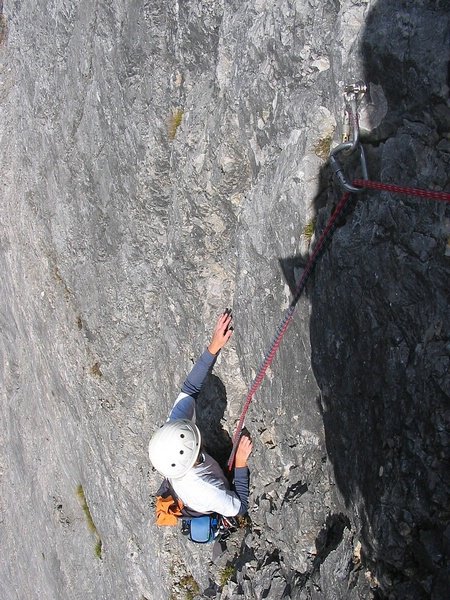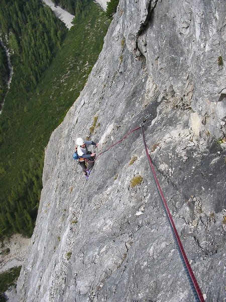 Achtung: Es hat daneben einen Felssturz gegeben und deshalb liegt sehr viel lockers Gestein herum. Diese Tour sollte daher nicht mehr geklettert werden und BHs werden wahrscheinlich der nächsten Zeit entfernt (Stand: 28.8.2014).