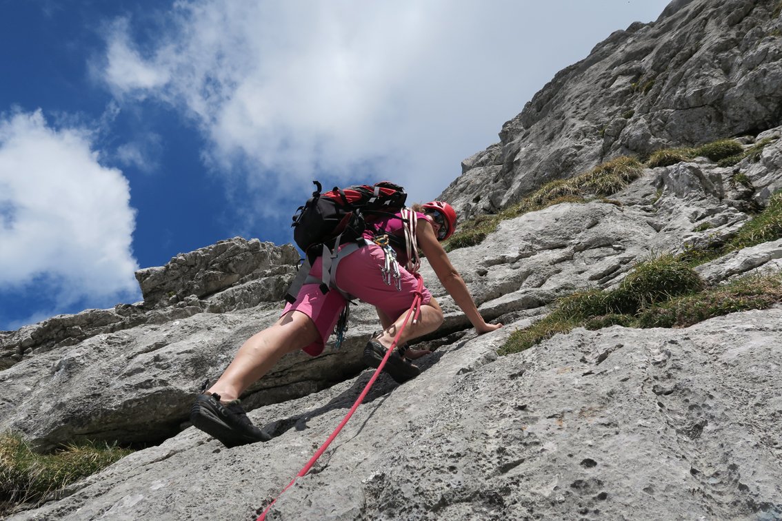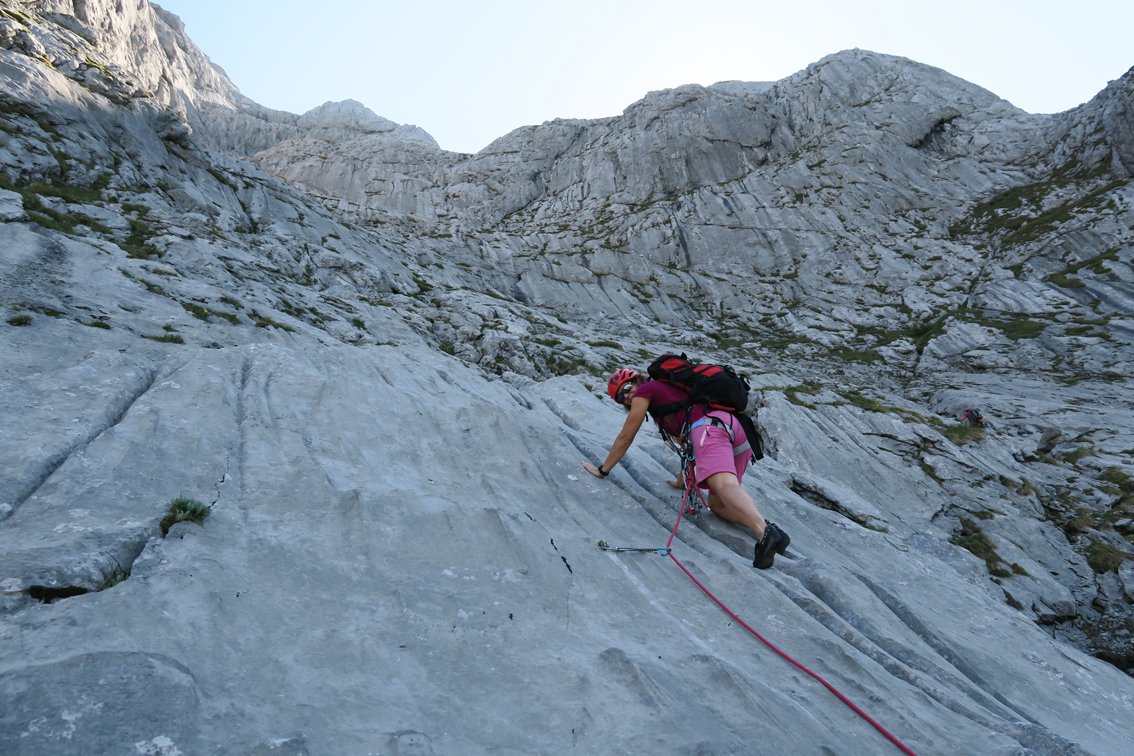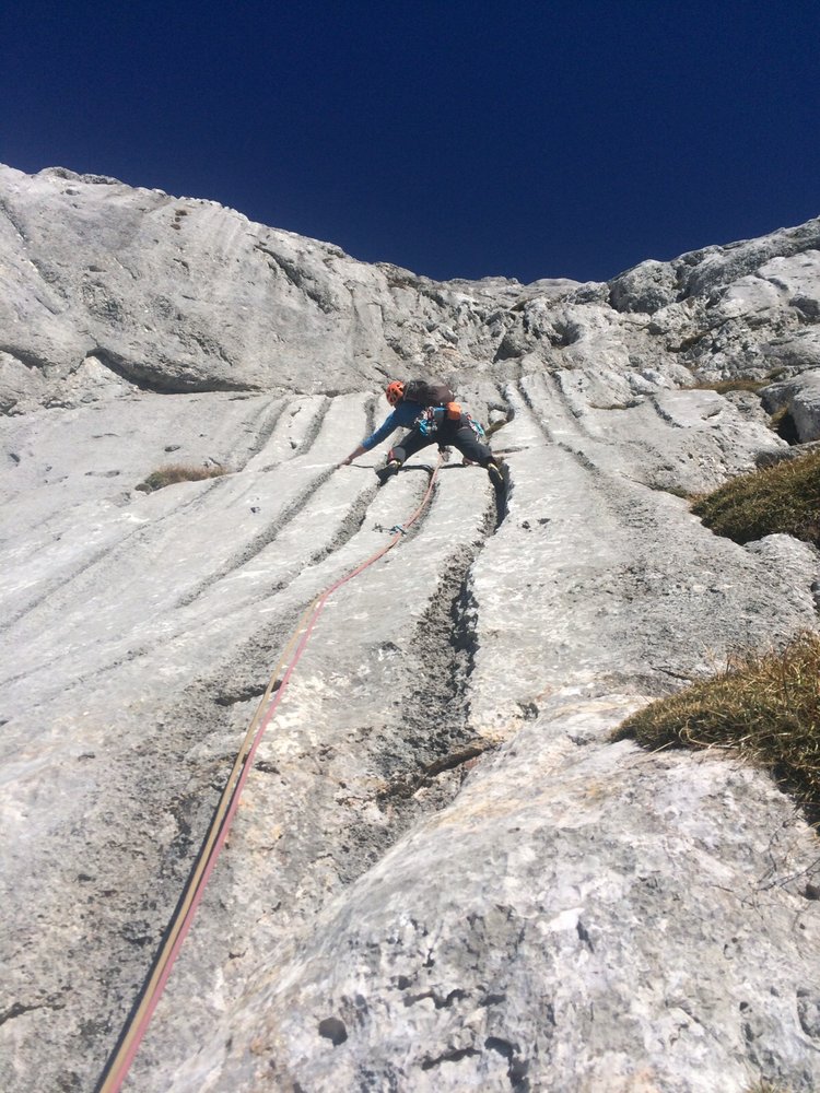In den leichteren Seillängen gibt es etwas größere Bohrhakenabstände, evtl. kleine und mittlere Keile und Friends von Vorteil (aber nicht leicht anzubringen).