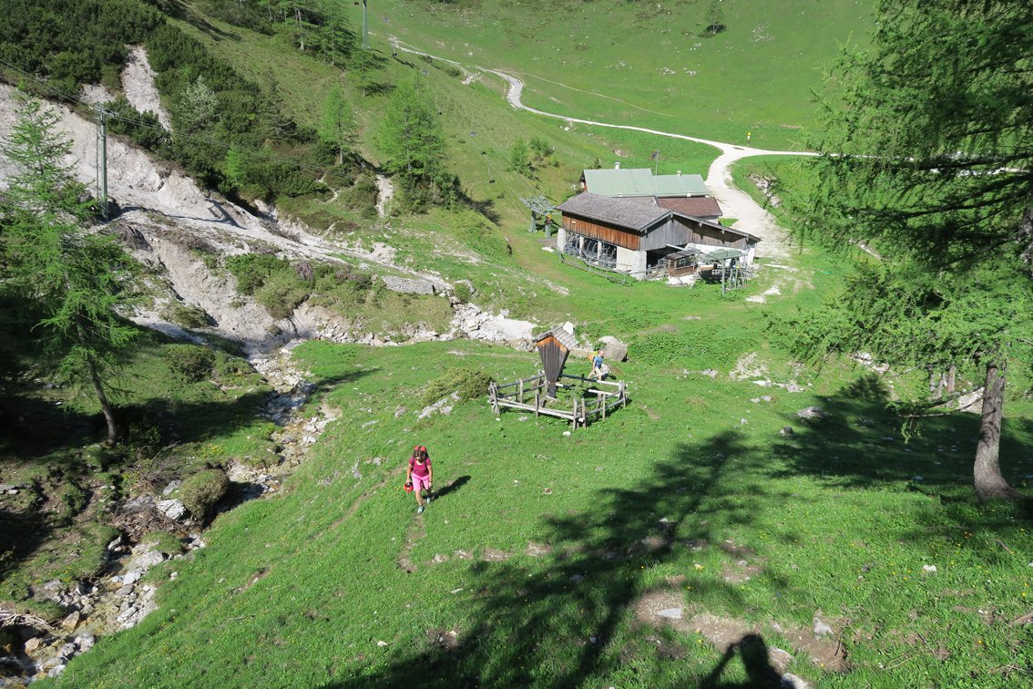 Vom Ausstieg über Schrofen und steiles Gras auf dem flacher werdenden Rücken (Steinmänner) rechtshaltend zum Jägerkreuz, dort trifft man auf den markierten Normalweg. Entweder direkt vom Kreuz hinunter oder noch schnell hinauf zum höchsten Punkt mit Gipfelkreuz des Hohen Bretts (ca. 130 Hm ab Jägerkreuz). Beim Abstieg in Richtung Stahlhaus zweigt ein unmarkierter, breit ausgespülter Steig direkt zur Mitterkaseralm ab.