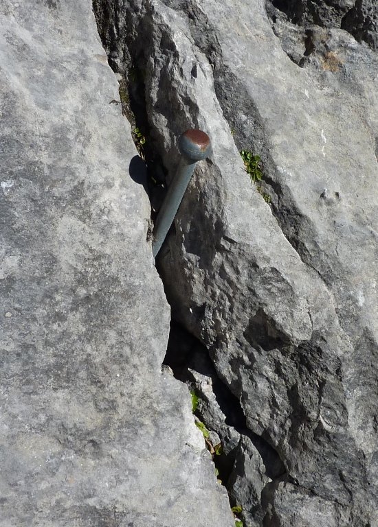 Der Einstieg in der mächtigen Südwand ist fast am tiefsten Punkt bei genialen Platten. Der Einstieg ist mit einem "Schalthebel" aus Metal markiert, welcher in einem Riss steckt. Einfach den goldenen Bolts folgen.