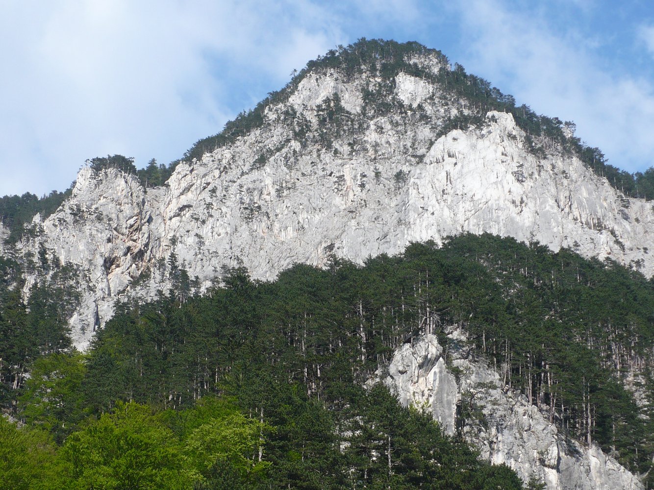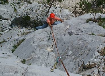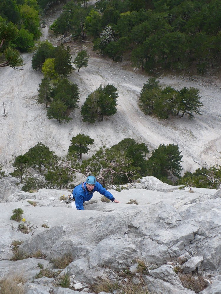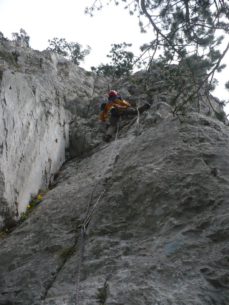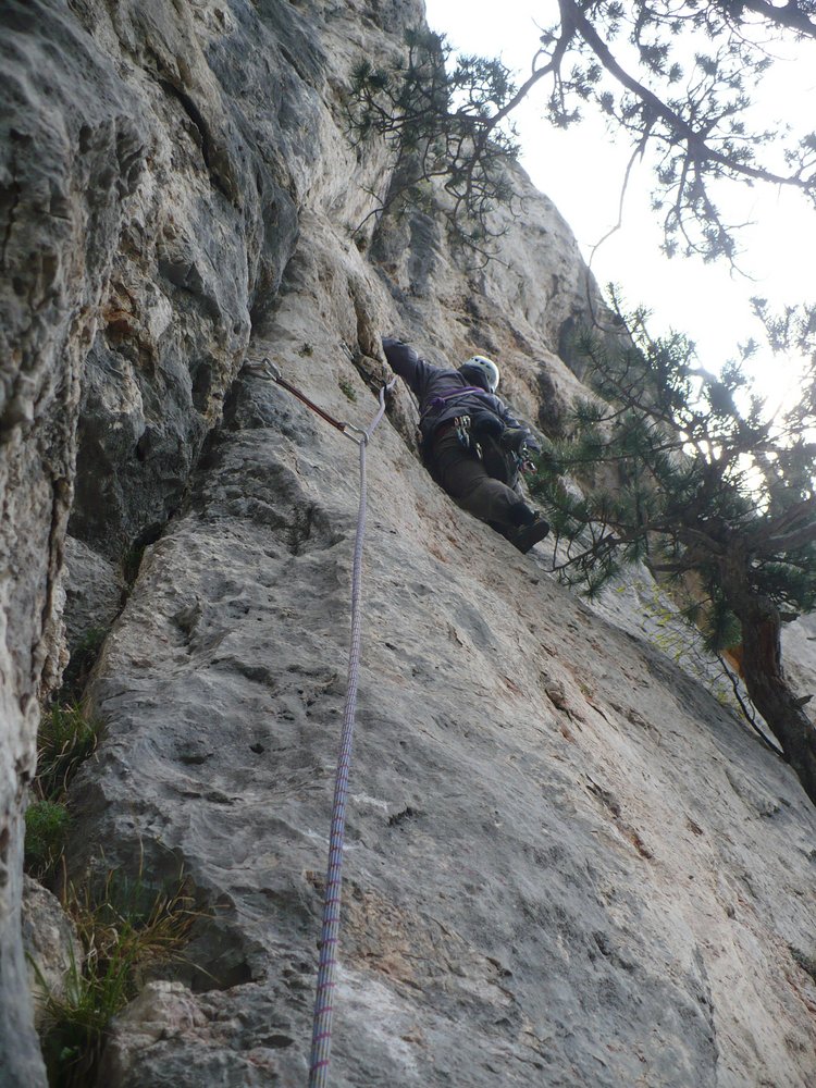 War leichter als 5+ (gefühlt leichter als die zweite SL). Die Platte hoch, gut versichert. Am Ende der Platte noch ein sehr schöner Riss. Zum Schluss durch baumbestandenes Gelände leicht links hoch zum Stand an einem Baum.