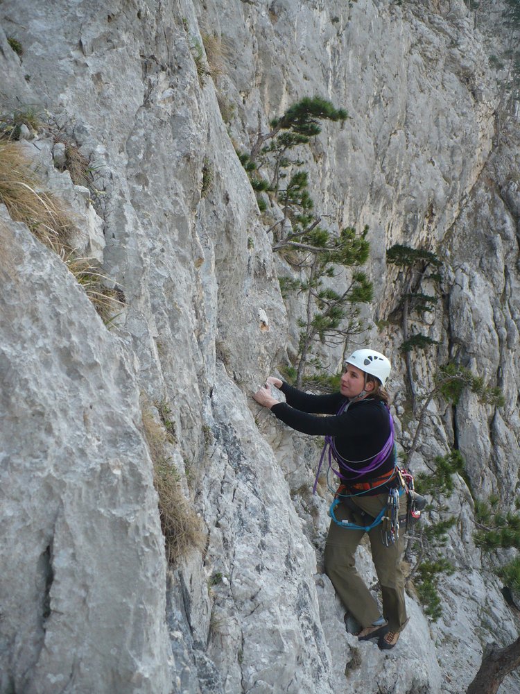 Direkt nach dem Stand horizontal nach rechts queren an zwei Bäumchen vorbei zum ersten Bolt, dann gerade die Platte nach oben. Gut abgesichert. Sehr schöne Kletterei. Am Ende der Plattenwand von deren „Gipfel“ runter und Stand bei einem Baum vor der nächsten Wand.
