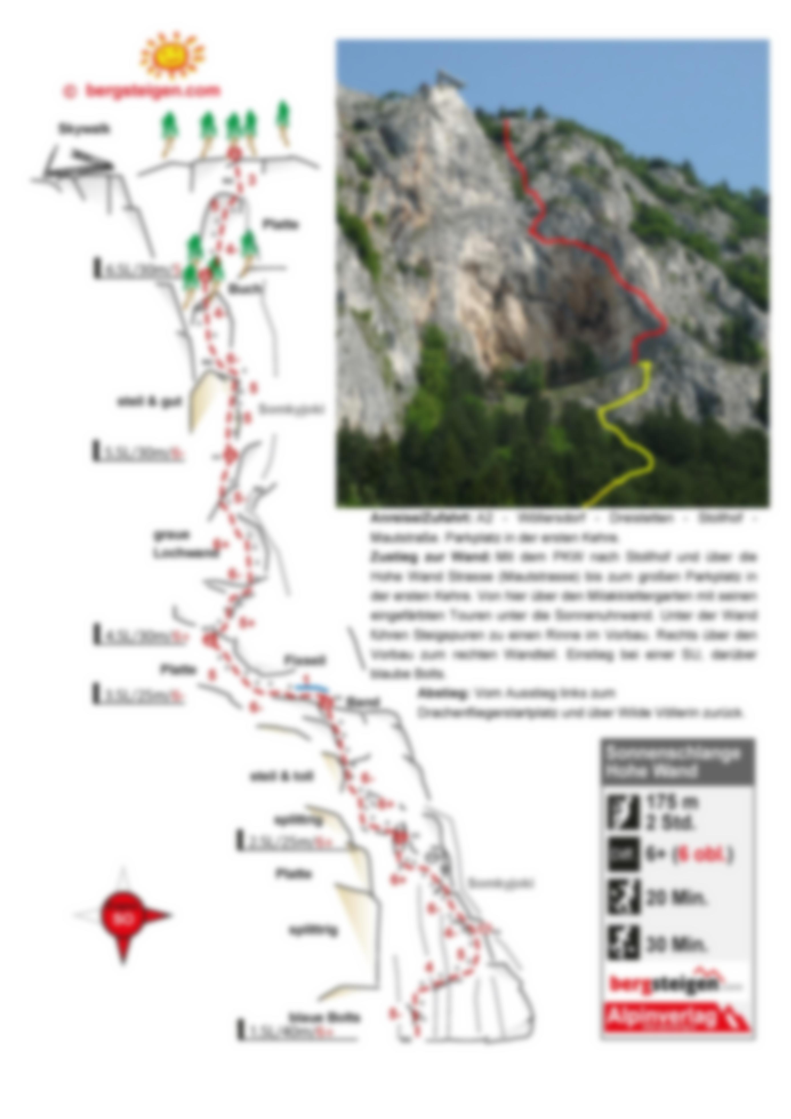 Von der ersten Kehre über die Wiese zum Wandfußsteig aufsteigen und auf diesem rechts vorbei am ÖTK-Klettersteig unter die Sonnenuhrwand. Etwa in der Mitte der Wand führen Steigspuren zu einer Rinne im Vorbau. Durch die Rinne überwindet man den Vorbau und geht darüber unter den mächtigen roten Überhängen zum ganz rechten Wandteil der Sonnenuhrwand mit mehreren Kurzrouten. Der Einstieg ist bei einer Sanduhr, darüber blaue Bolts.