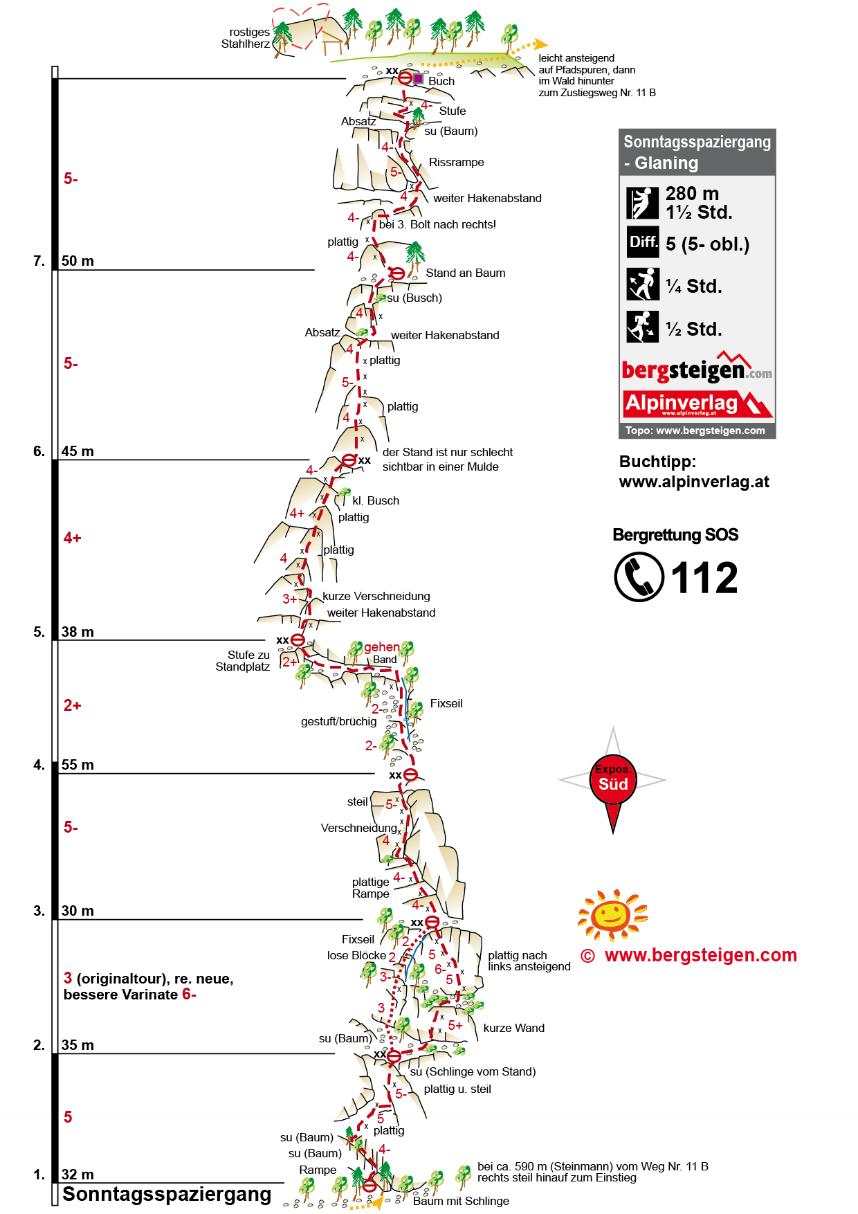 Der Sonntagsspaziergang ist die rechte Route mit Bohrhaken unterhalb des Gasthofes Noafer in Glaning. Die Route hat durchaus Charme und wirklich schönen Kletterpassagen - im leichteren Gelände muss man aber schon mal etwas weiter vom Bohrhaken wegklettern, da sollte nur ein sicherer Vorsteiger voran gehen. Das Klettern an den rötlichen Porphyr-Felsen macht aber Spaß und man hat einen perfekten Ausblick auf Bozen bzw. sieht man in der Ferne die spitzen Felszacken der Dolomiten. Ein lohnendes Kletterabenteuer, welches man wegen dem kurzen Zu- und Abstieg auch gut mit der links daneben liegenden "Dirty Flirty" (6-/6, sehr gut mit Bohrhaken abgesichert) kombinieren kann.