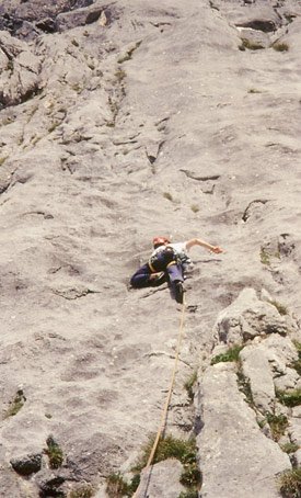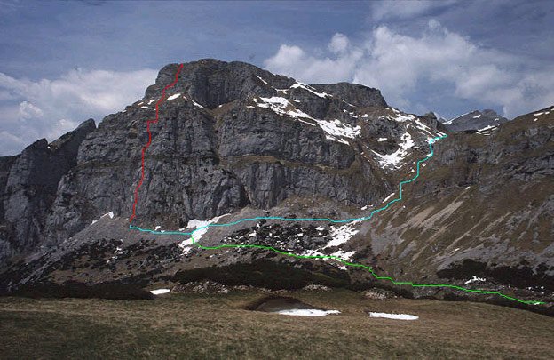 Variante a) Von der Bergstation Rofanbahn (Maurach) über den Grubasteig zur Grubascharte. Rechts abwärts Richtung Schermsteinalm und über den breiten Wandvorbau zum Einstieg 11/2 Stunden.