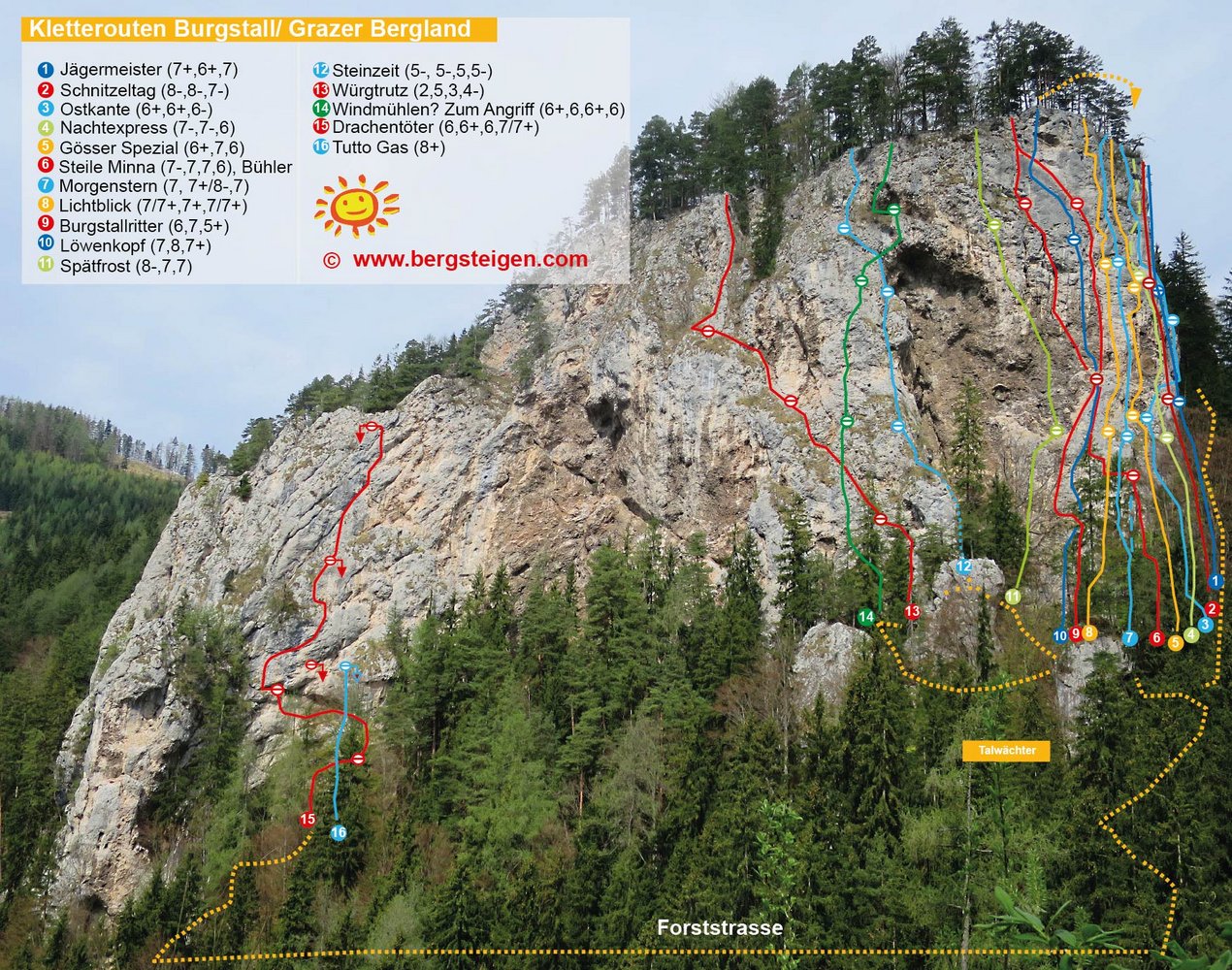 VAusstieg leicht rechts haltend eben im Wald weiter, bis man steil im Wald auf der Hinterseite des Burgstalls (N) auf kleinem Steig absteigen kann. Man kann direkt zum Forstweg oder zum Einstieg zurück absteigen. Weiter zurück über den Aufstiegsweg.