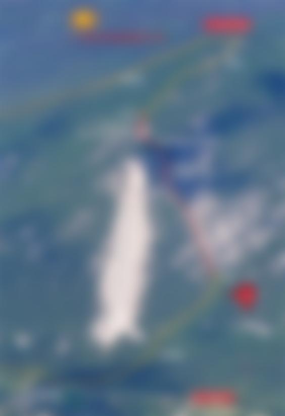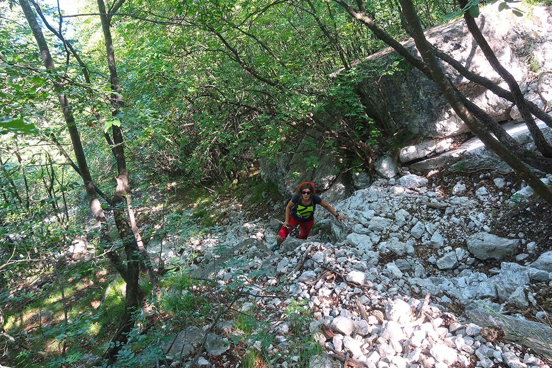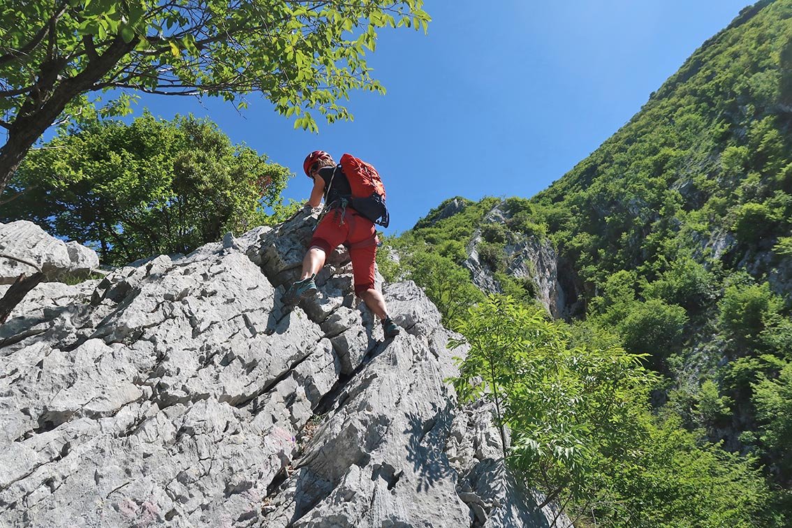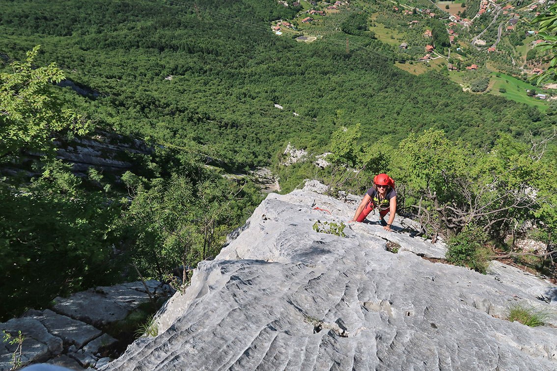 Siehe Topo: Anfangs steiles Gehen, dann bei Pfeil nach rechts zum Grat. Jetzt lange auf dem Grat (Stellen bis 2+), oben quert man einmal bei rotem Pfeil nach rechts (Bohrhaken) parallel zum Grat. Nach diesem erreicht man einen flachen Rücken, dort links (Schlingen an Bäumen und rote Punkte) über eine Stufe zum Standplatz (2 Bohrhaken) an der Schlusswand. Dort jetzt noch 3 Seillängen wie im Topo bis zum Ende.