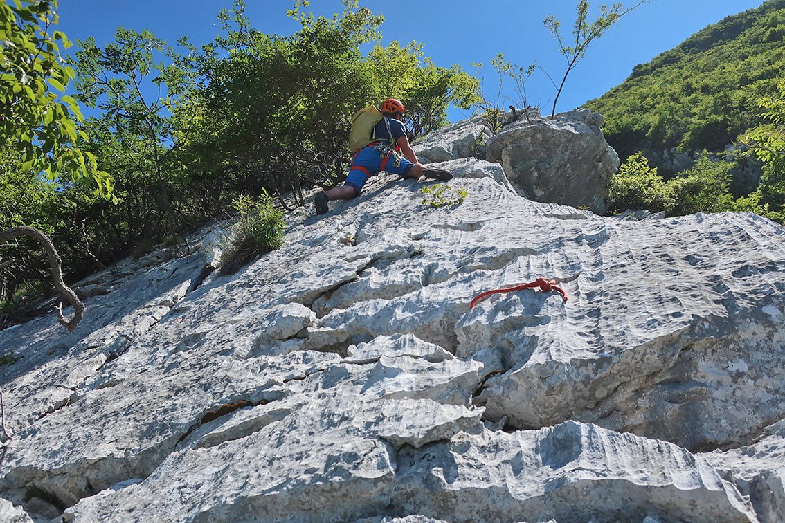 Spigolo Bianco – weiße Kante – dieser Name klingt doch toll und wenn das ganz noch oberhalb der tiefblauen Fluten des Gardasees ist, kann man die Tour eigentlich gar nicht mehr topen. Und wirklich, dieser Gratanstieg hat Klasse! Unten geht es an extrem vom Wasser zerfressenen Fels aufwärts – quasi jeder Griff ist eine Sanduhr. Als Finale folgen dann noch 3 Seillängen anregende Kletterei, die man dank der guten Bohrhakenabsicherung auch mit Zustiegsschuhen stresslos schafft. Beim Abstieg – bei dem man zuerst aber noch 150 Hm aufsteigen muss – klettert man durch eine kleine Höhle, um dann den Aufstieg auf der Wiese beim Col dei Piombi zu beenden. Gesamt ein wirklich tolles Kletterabenteuer, das einen sehr schönen Kontrast zu den Felswänden rund um Arco verspricht – klettern direkt oberhalb des Gardasee, das hat einfach was.