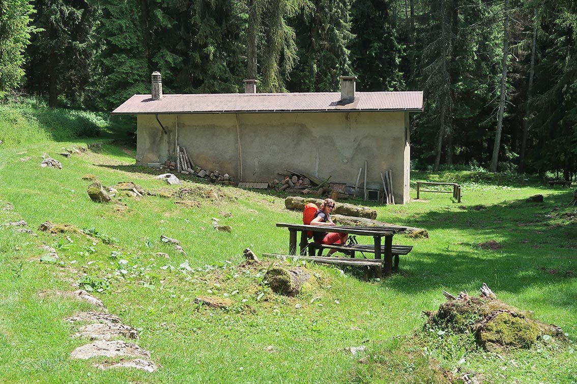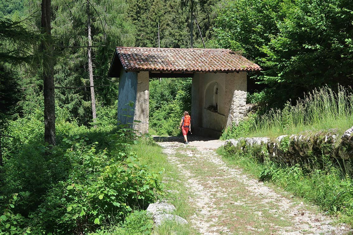 Vom Ende geht man im steilen Buschwald aufwärts – auf die schwache rote Markierung achten! – oben gelangt man zu einer Felswand mit Höhle. Durch die Höhle durch und danach auf die Wiese beim Col dei Piombi. Dort geht man links auf dem Wanderweg zurück zur Mittelstation der Seilbahn.