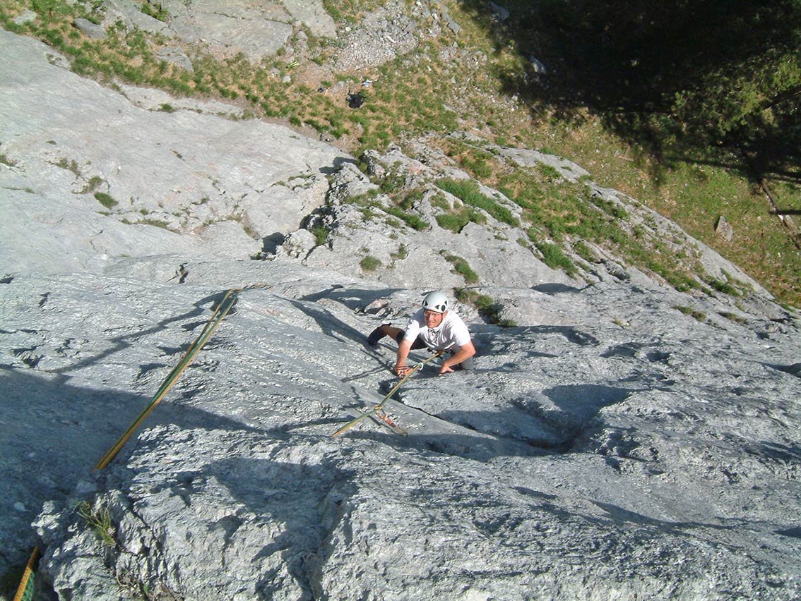 Schöne Plattenklettereian der Oberen Diesbachwand. Die Route hat ein paar fantastische Kletterlängen, aber auch ein einige grasige Stellen. Mann sollte sich von der Höhe des ersten Hakens nicht abschrecken lassen - danach ist die Route gut gesichert.