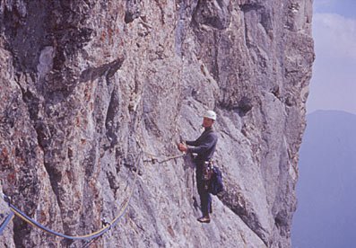 Achtung: Die Abseilstrecke ist sehr ausgesetzt und nur etwas für Geübte. Der letzte Abseilstand ist einige Meter westlich unter der Plattenkante versteckt.