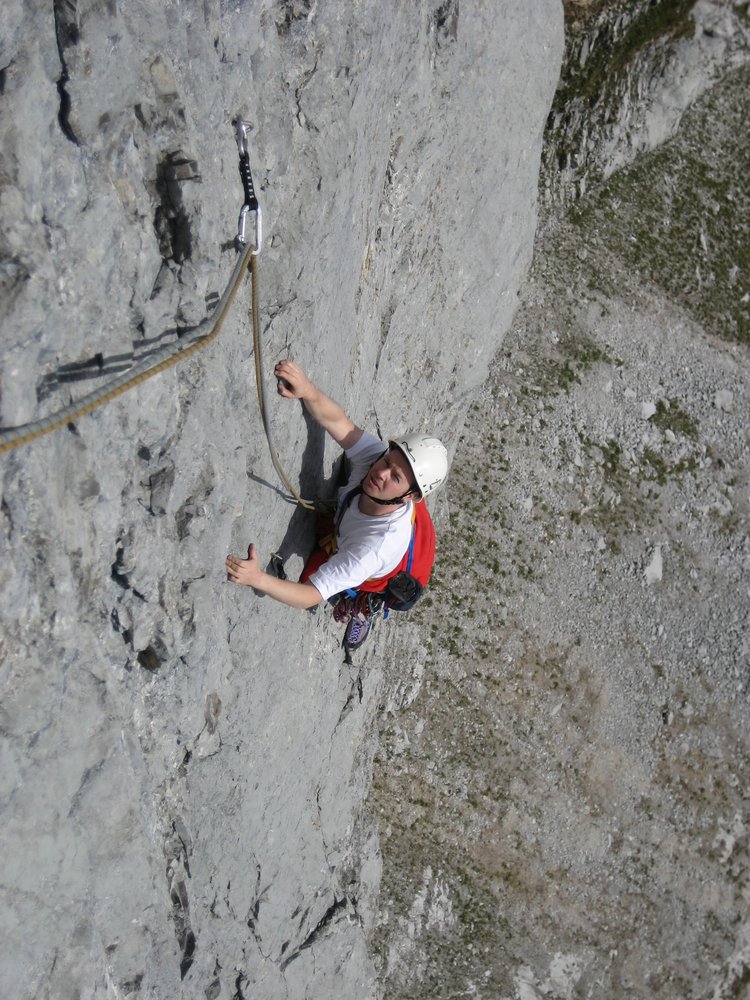 Entweder zum Gipfel weiter und im Bogen ins obere Rauchtal und durch diese absteigen oder mit 2x50 Doppelseil über die Tour abseilen (Speziell die 2. SL ist aber rucksackfeindlich).