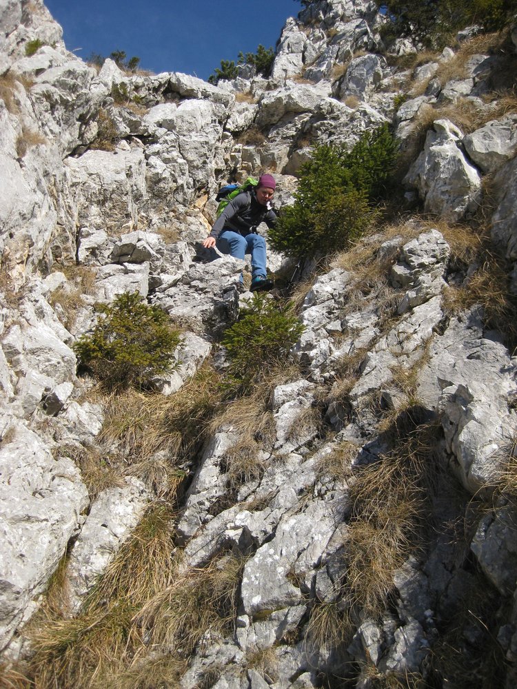 Vom Gipfelkreuz des Steinecks (1418m) in Gratnähe zwischen Latschen nach Westen. Auf der Südseite auf grasigem Fels entlang der Wand bergab (1+, schwierigste Stelle, bei Nässe unangenehm) und rechts hinauf in die Scharte. Dann den Möglichkeiten folgend, die nächsten Türme nord- bzw. südseitig umgehen, teilweise auf steilen Grashängen. Weiter unschwierig am Kamm oder links davon bis in die Scharte (1200m) vor der senkrechten Ostwand des Kleinen Katzensteins (von hier kann man notfalls nach Nordwesten durch den sehr steilen Bärengraben zum Laudachsee absteigen).