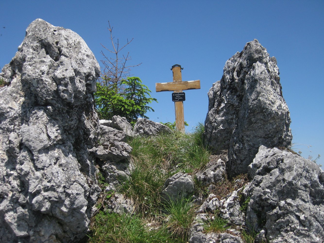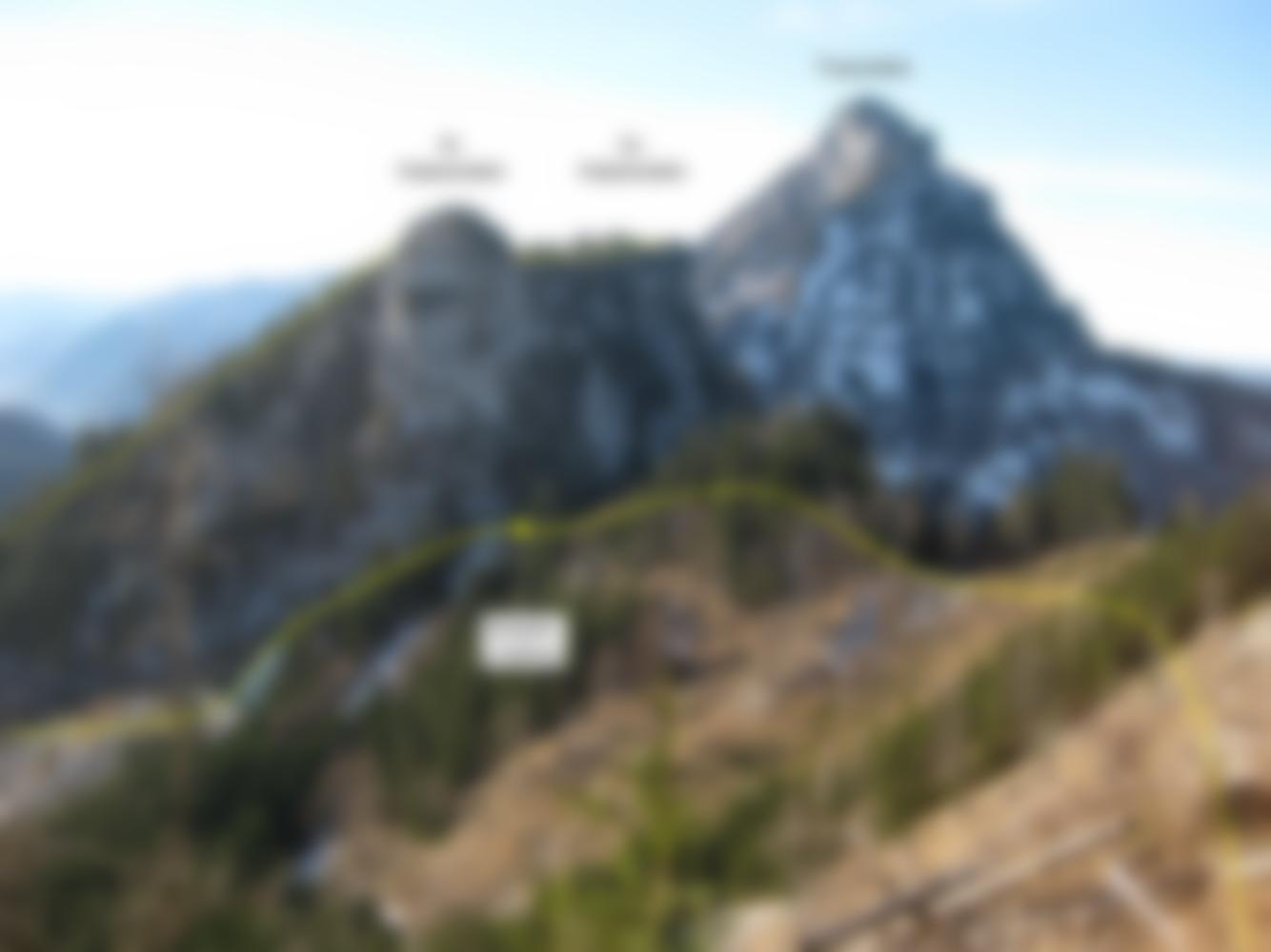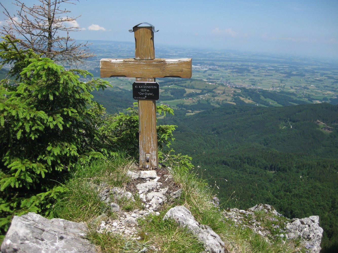Die Ostwand umgeht man großräumig über links: Ca. 100 Hm am Wandfuß nach Süden bergab, bis man in steilem Wald gefahrlos nach rechts über den Rücken auf die Südseite gelangen kann. Über die Südflanke 200 Hm unschwierig zum Kleinen Katzenstein (auch Katzenstein-Ostgipfel genannt). Von hier auf schwachen Wegspuren nach Westen in 20 min. zum Großen Katzenstein (1349m).