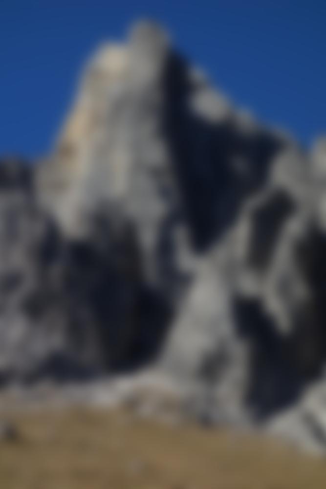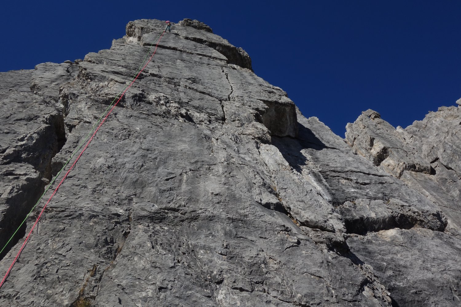 4. SL: Über herrliche Verschneidung (3 BH, 5+) hinauf und nach rechts auf die Geschossspitze. Standmöglichkeit. Über kleinen Wulst (6-) und die folgende Platte (5, 2 BH) in leichteres Gelände und zu weiterer Standmöglichkeit. Weiter über herrliche Platten (5+), dann in leichterem Fels etwas linkshaltend zum Stand auf Band. (60m, 10 BH, 1 NH)