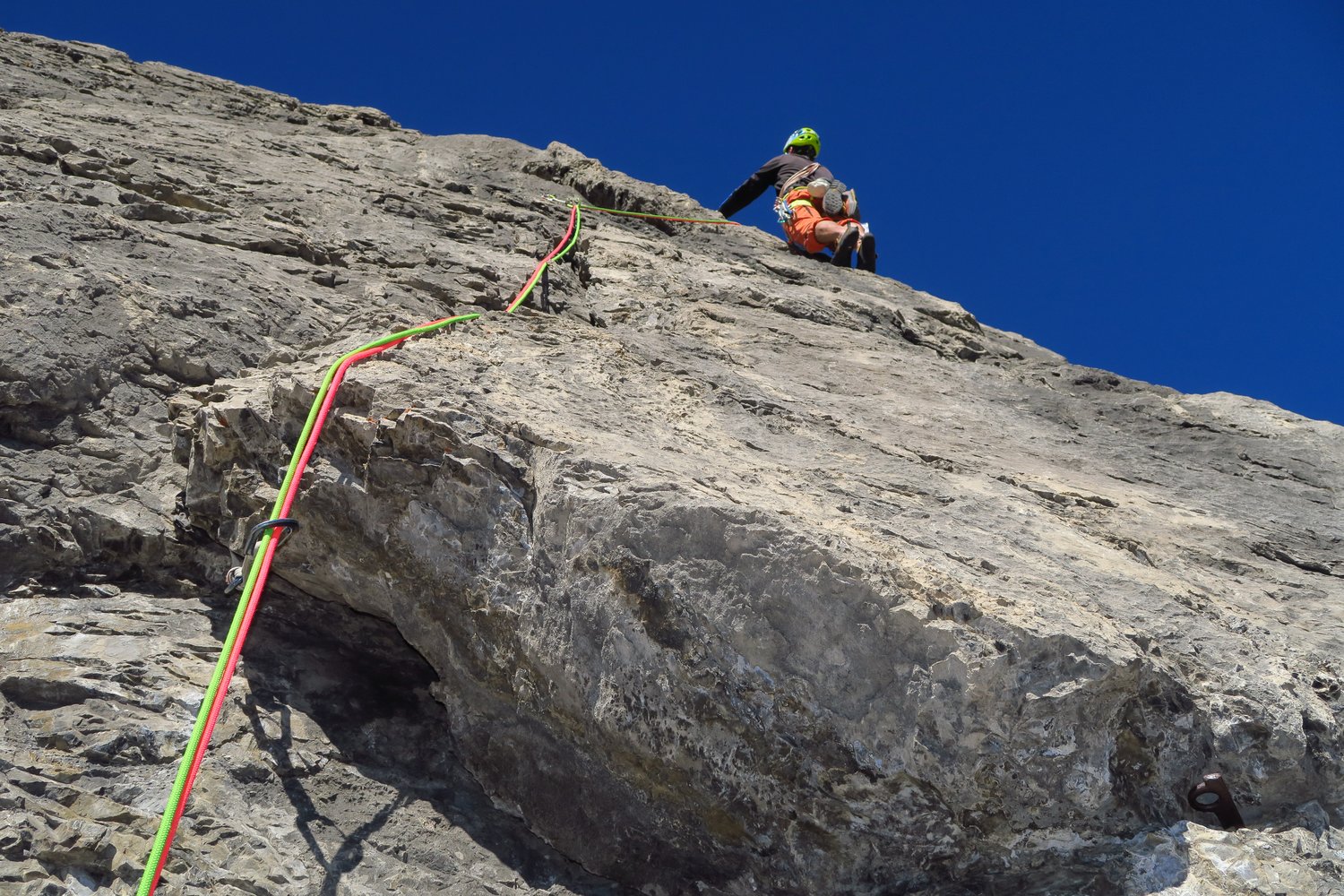 1. SL: Vom Einstieg etwas trickreicher Quergang links aufwärts (6). Am 2. BH wird’s schon wieder leichter (5) und man folgt einem schönen Riss durch schwarze Platten zum Stand. (20m, 6, 5 BH)