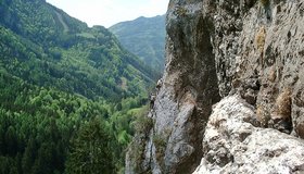 Vom Ausstieg leicht rechts haltend eben im Wald weiter, bis man steil im Wald auf der Hinterseite des Burgstalls (N) auf kleinem Steig absteigen kann. Man kann direkt zum Forstweg oder zum Einstieg zurück absteigen.