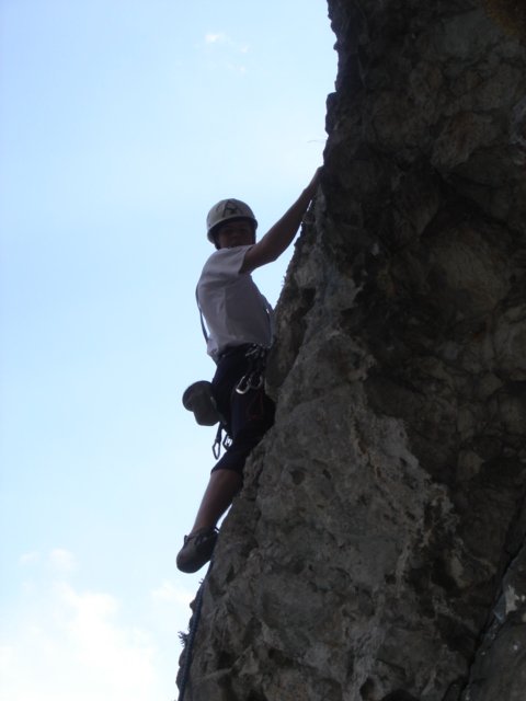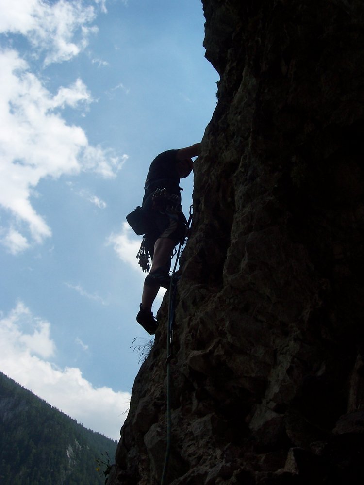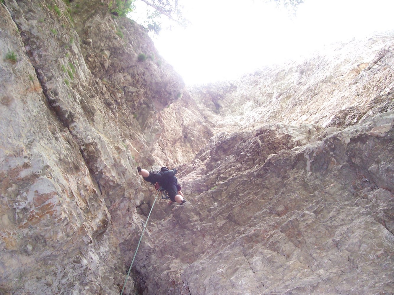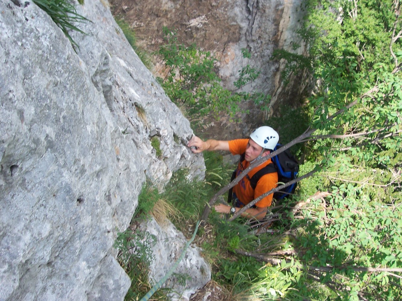 Aus Begeisterung über den schönen Kamin in der 1. Seillänge zu hoch gestiegen und vergessen, links "abzubiegen". Dann bleibt nur mehr eine Hakenlose Querung (5+) in die 3. SL. Sehr luftig.... Wie gut, dass es 60m-Seile gibt.,