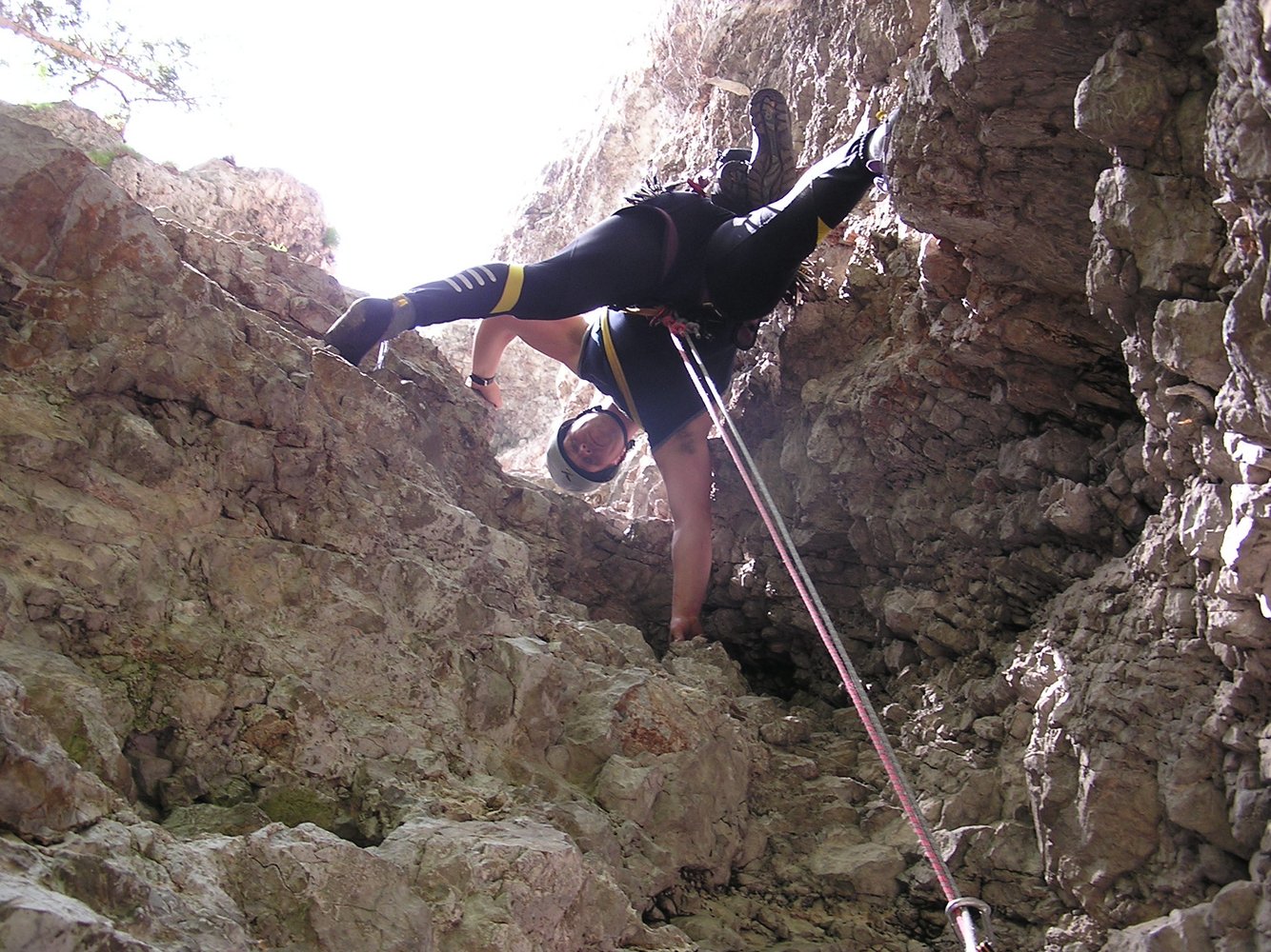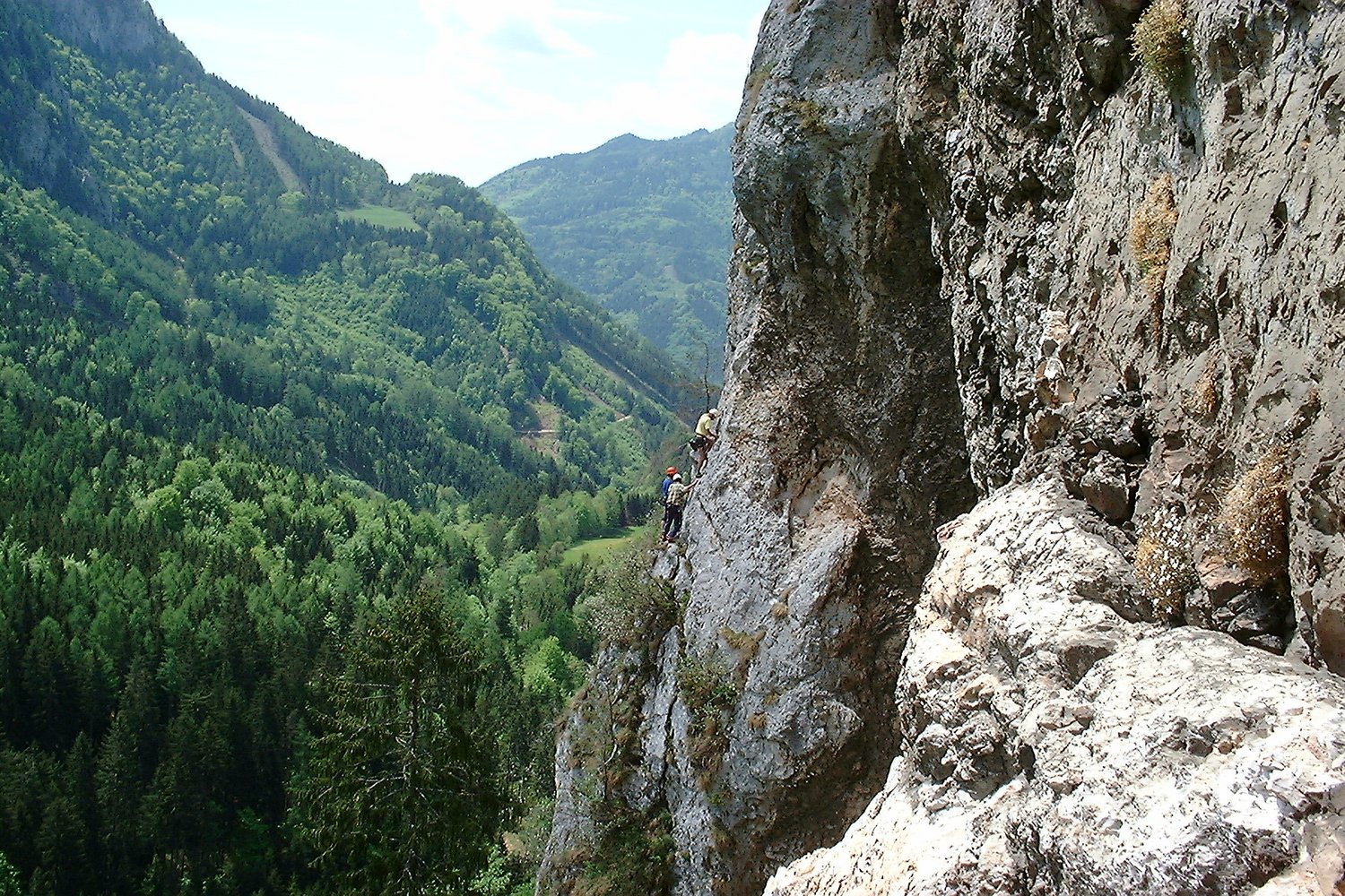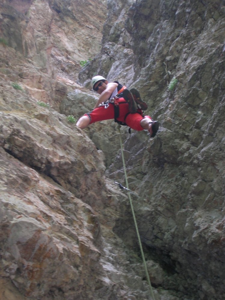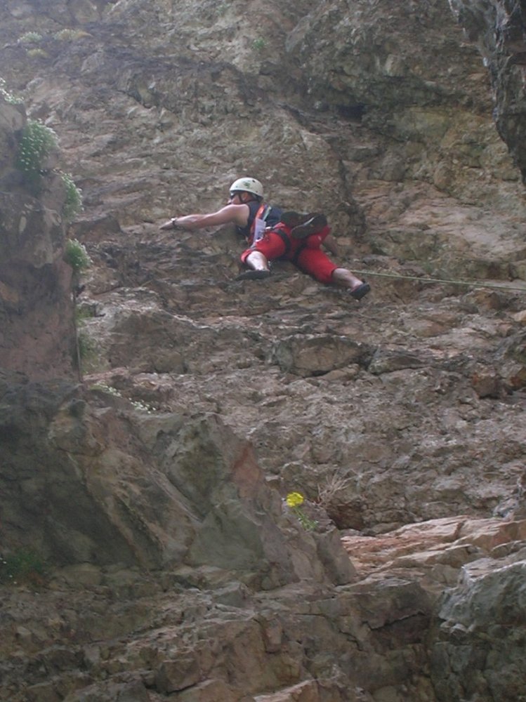 Aus Begeisterung über den schönen Kamin in der 1. Seillänge zu hoch gestiegen und vergessen, links "abzubiegen". Dann bleibt nur mehr eine Hakenlose Querung (5+) in die 3. SL. Sehr luftig.... Wie gut, dass es 60m-Seile gibt.,