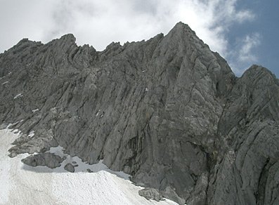 Notausstieg vom Südgrat: Nach dem dritten Turm und noch vor dem Kamin kann man vom Zackengrat bei Standhaken linker Hand über schrofiges Gelände eine Rinne (ca. 1) abklettern.
