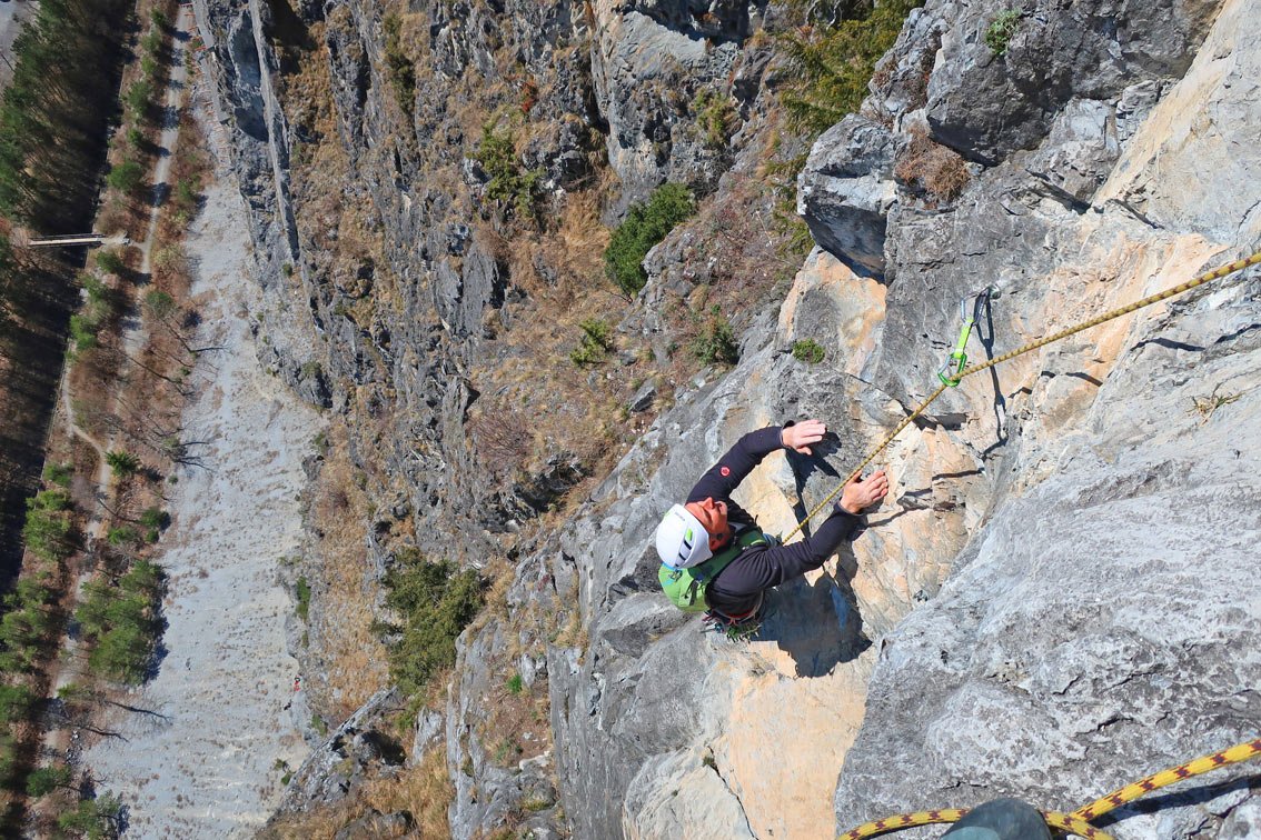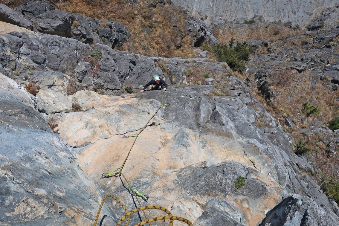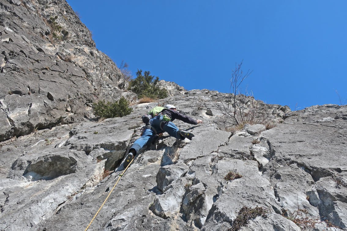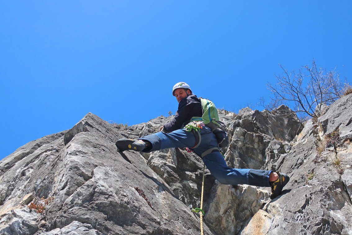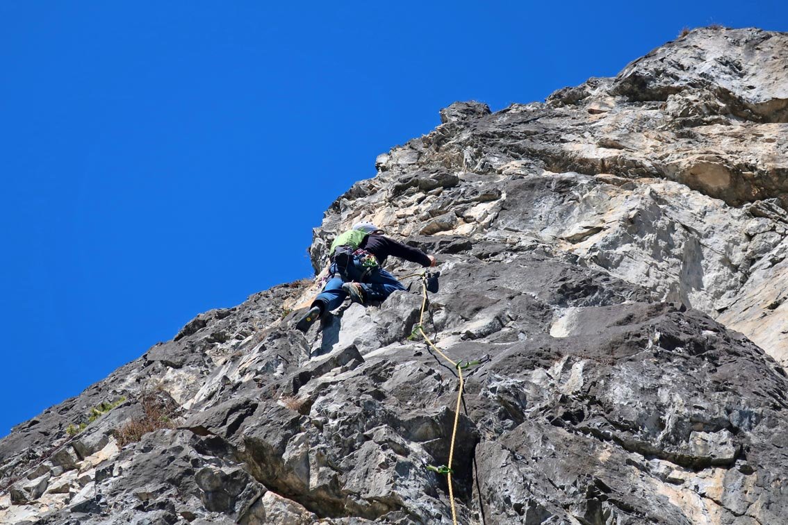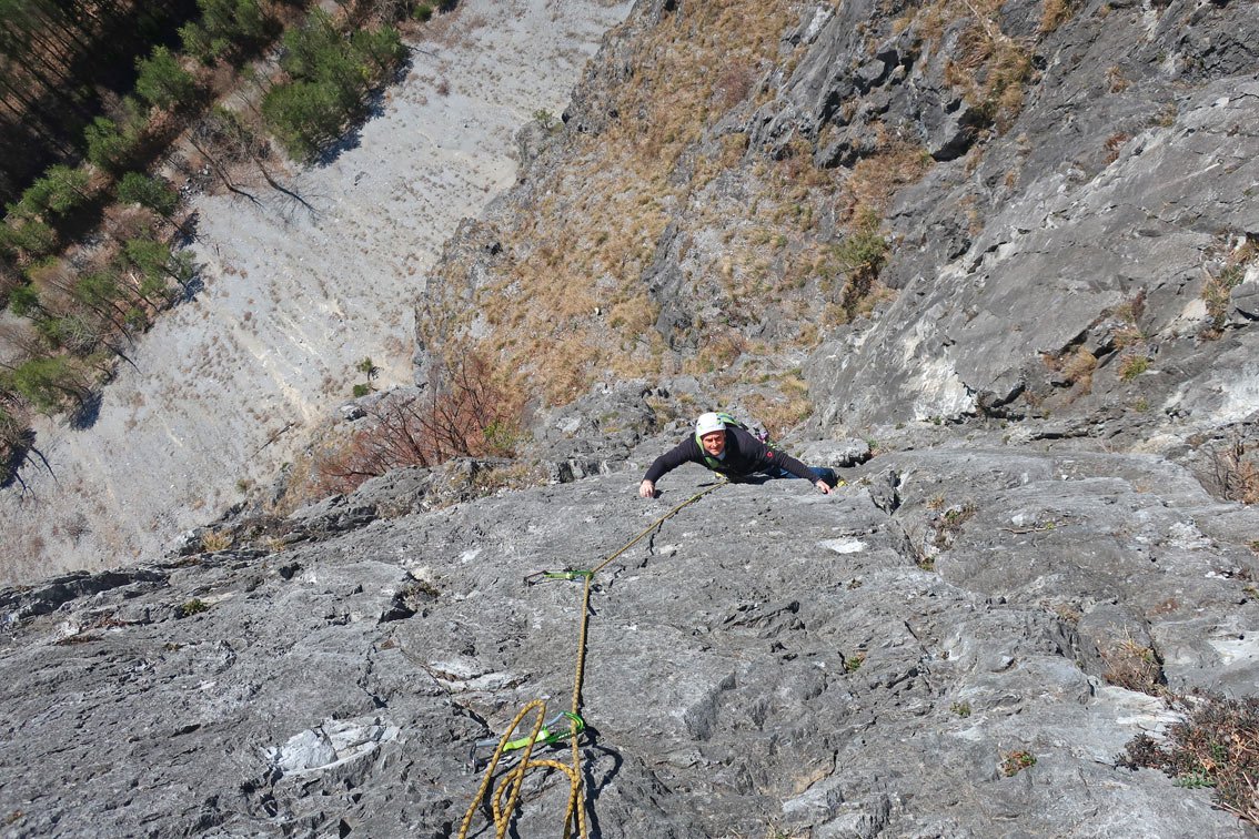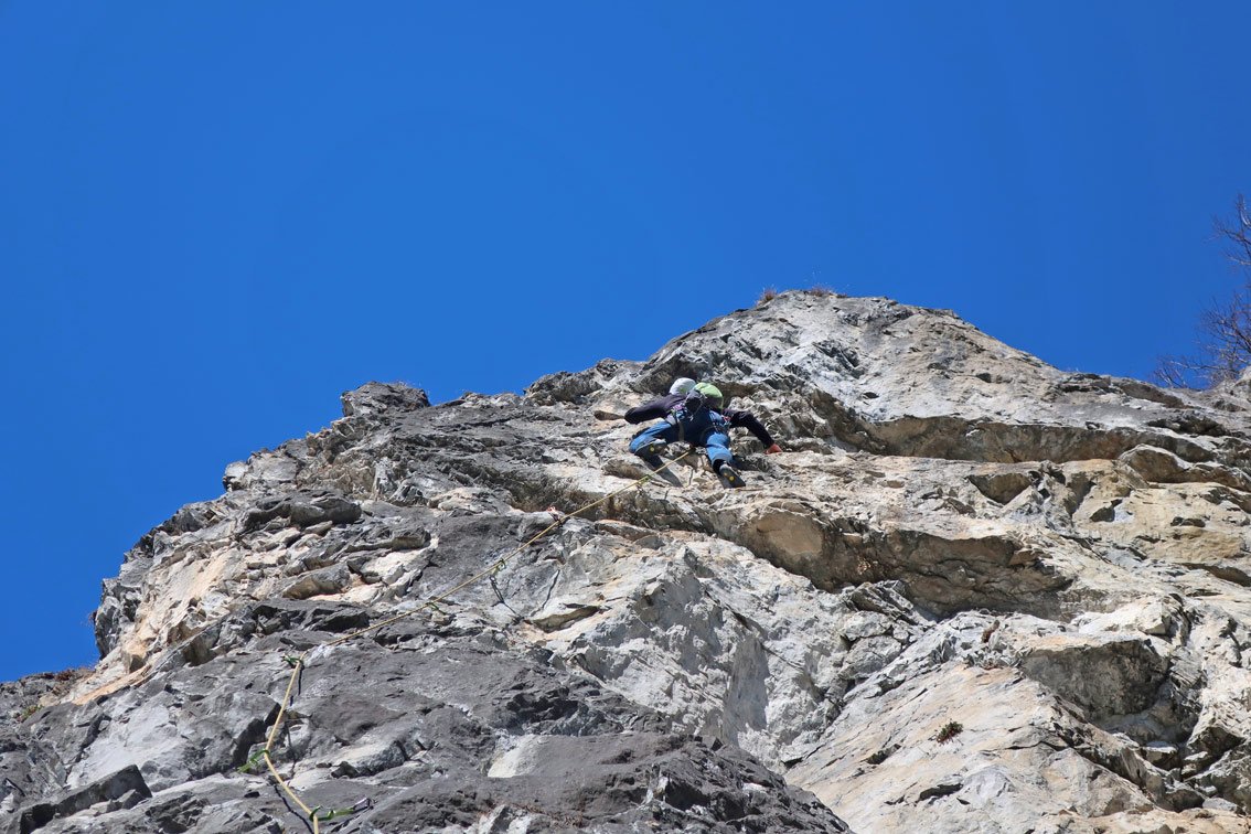 Trotz der überwiegend guten Felsqualität ist nicht jeder Griff fest, man sollte auf jeden Fall einen Helm tragen!