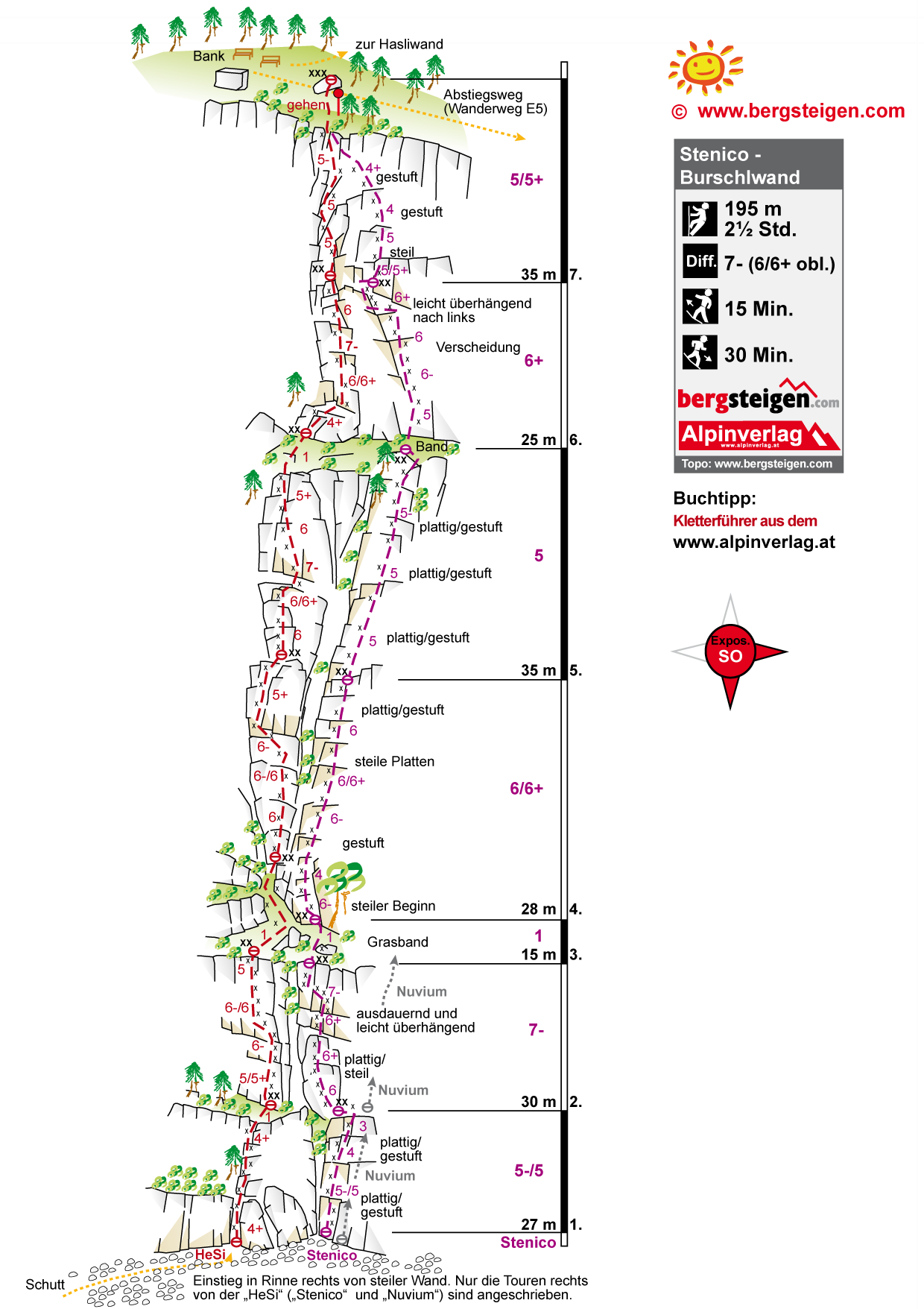 Die Stenico gehört zu den besten Burschlwandtouren und verläuft durch den zentralen Wandteil. Immer sehr schöne Kletterei - überhängende, griffige Platten und schöne, steile Wandpassagen machen diese Tour zum Genuss. Wer den oberen 6ten Grad beherrscht, sollte sich dieses Schmankerl nicht entgehen lassen.