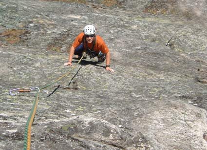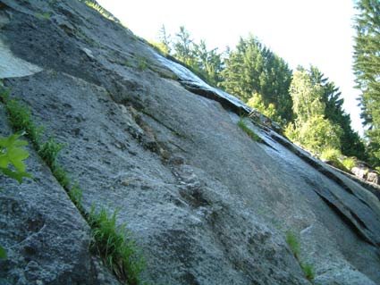 Leider etwas inhomogen, unten eine kurze Passage 5-, oben dann nur noch bis 3+ über glatte Platten, bei denen man nur die Füße braucht. (in der 2ten Länge über Wasserstreifen nach rechts queren)