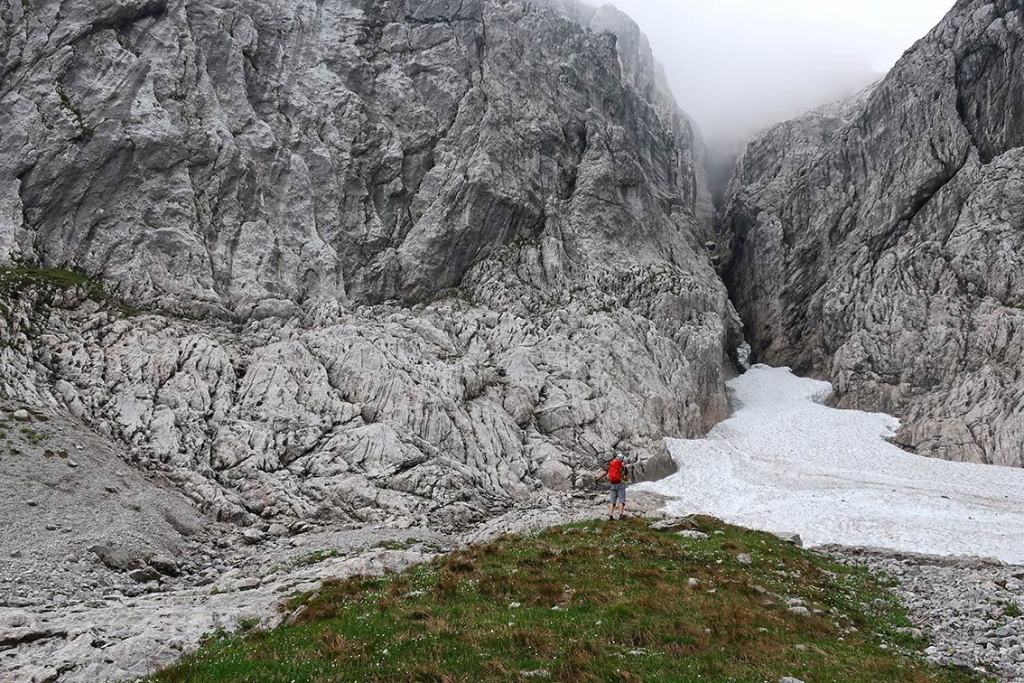 Von der Griesner Alm in Richtung Stripsenjoch bis in den „Wildanger“, das ist ein Flachstück mit Wiese vor der letzten Steigung zur Hütte (dort ist auch die Abzweigung des Eggersteiges in Richtung Ellmauer Tor). Auf Pfadspuren links vom Weg ab durch die Latschen in das große Kar mit Wiesenfläche gehen. Dort dann auf die Schlucht zwischen Fleischbank und Totenkirchl zusteuern - links davon auf einem kleinen Band sind die Einstiege (siehe Wandbild und Topo).