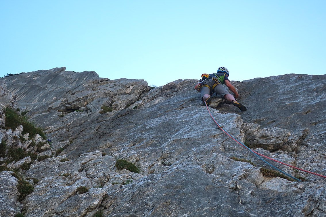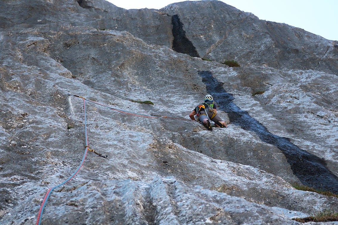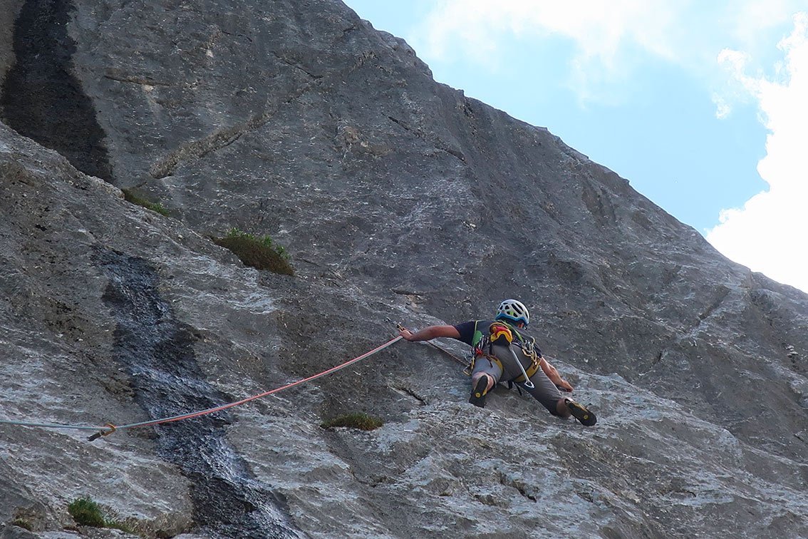 In der Schlüsselseillänge muss man etwas im Wasserstreifen hinauf, dann rechts zu einem Graspolster (dort ist ein alter fixer Klemmkeil), danach kommt die glatte Schlüsselstelle bei zwei Bohrhaken.