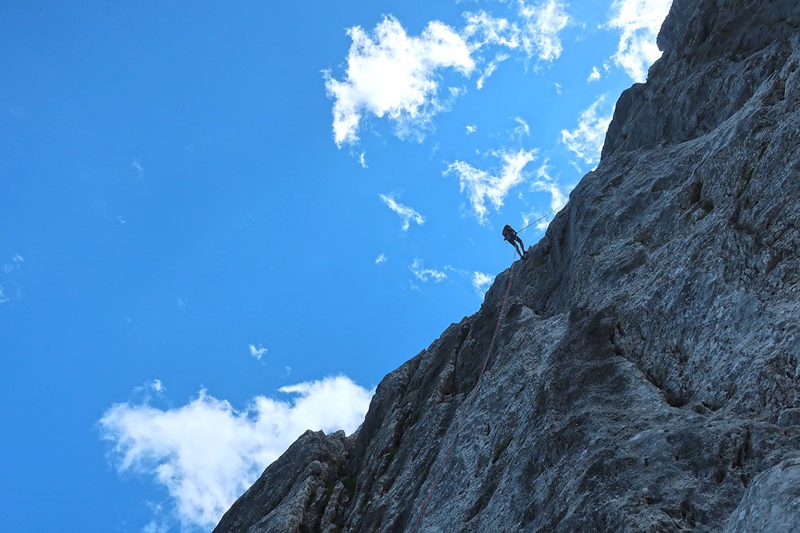 Man seilt über die Routen Herbstzeit bzw. oben über Baderwandl ab (siehe Topo). Man muss bis zum Boden 2 x 60 m abseilen.