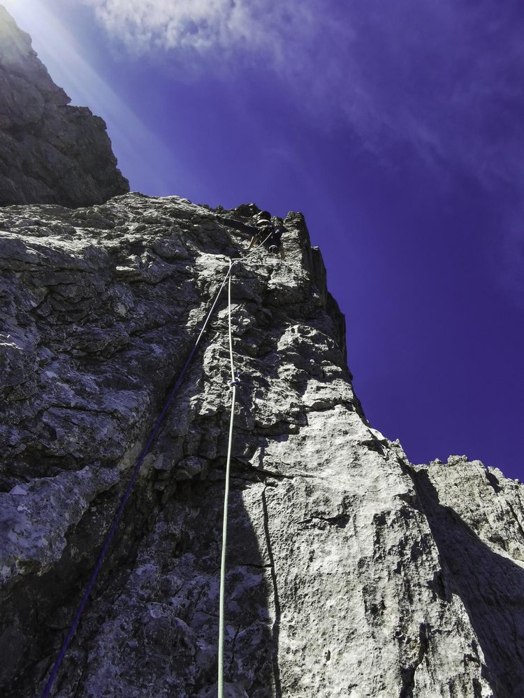 Schöne Linie entlang der Kante, gut abgesichert mit Bohrhaken, Stände gebohrt, Fels teils etwas brüchig, dennoch eine lohnende Route.