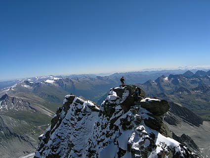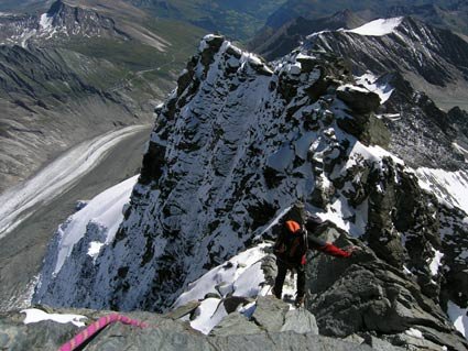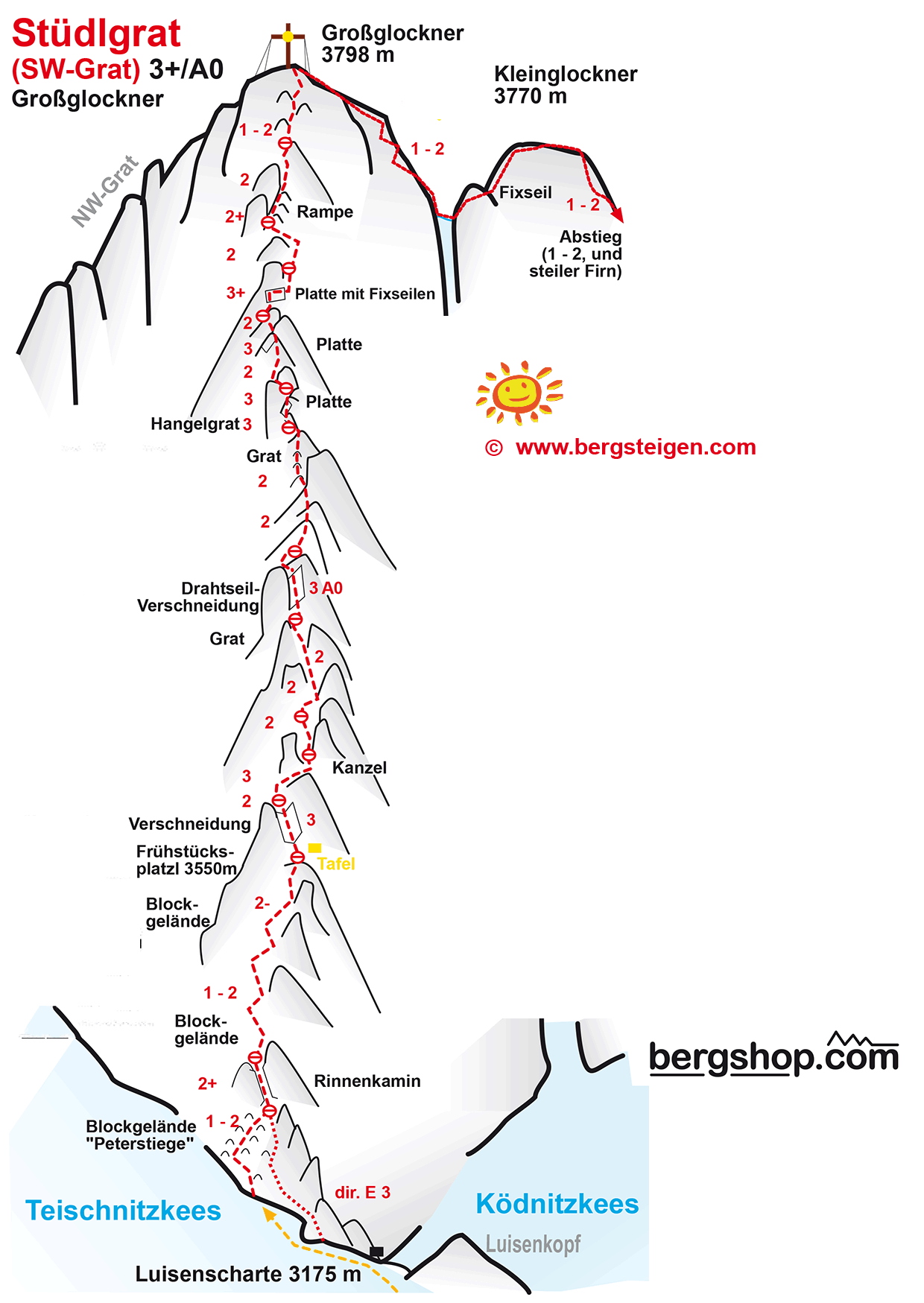 Der beste und beliebteste Gratanstieg auf den höchsten Berg Österreichs, fantastisch ausgesetzte Kletterei über den SW-Grat des Großglockners. Dieser hochalpine Anstieg auf den Glockner wird meist unterschätzt, Höhe, evtl. Vereisung und die Länge des Anstieges machen ihn zur ernsten Tour, obwohl die schwierigen Stellen oft Haken, Eisenstiften und sogar mit Drahtseilen entschärft wurden (Dies ist aber nur an kurzen Passagen der Fall - auch werden die Versicherungen von lokalen Bergführern oft verändert). Dieser Anstieg ist vor allem an schönen Herbstwochenenden zu empfehlen (meist wenig Schnee), bei schönem Wetter ist die Route fast immer überlaufen. Der Abstieg (2- und 40°) sollte vor allem bei großem Andrang zum Gipfel nicht unterschätzt werden, im Bereich des Glocknerleitls kommt es sehr oft zu stauähnlichen Zuständen.