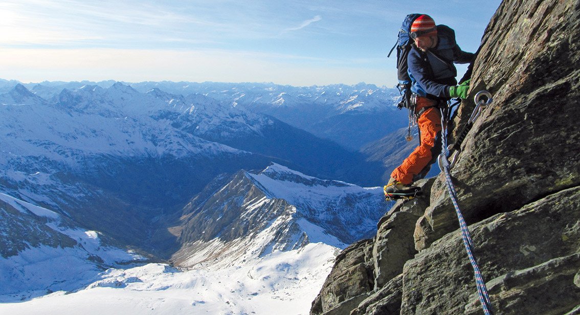 Einfachseil (es reichen auch 25 m), 3 -5 Expressschlingen, mehrere lange Bandschlingen, Gletscherausrüstung (Steigeisen, Pickel, Eisschrauben) und den Helm nicht vergessen!