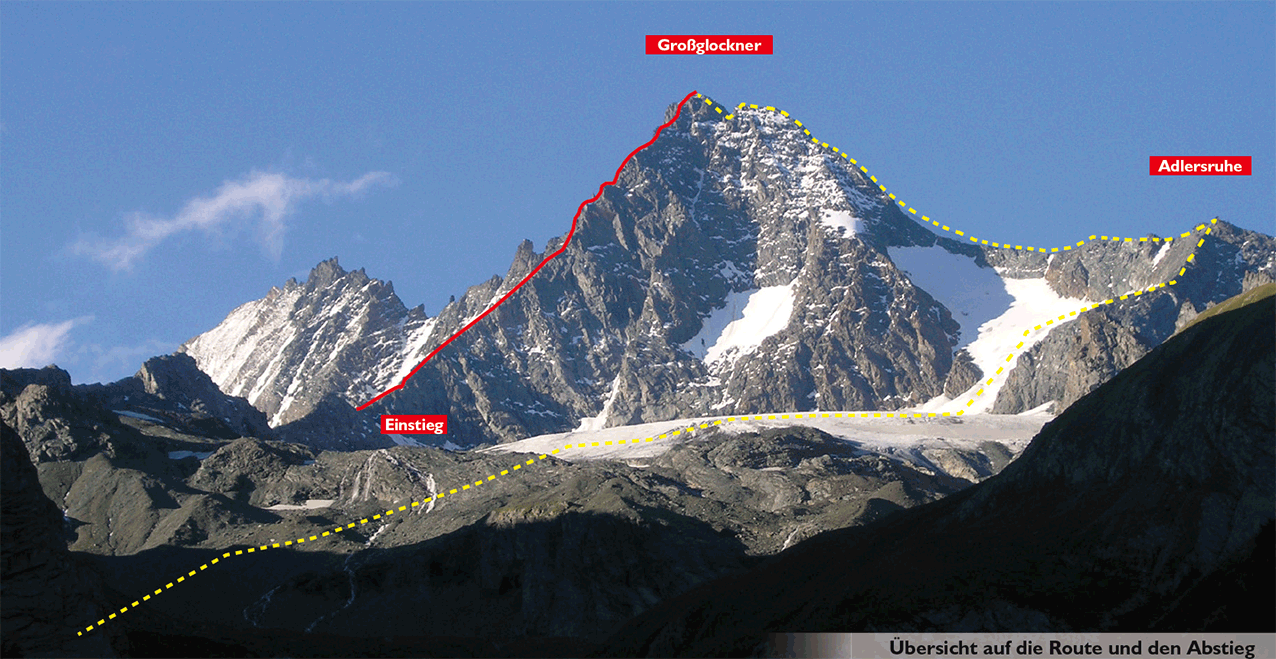 Zuerst hinab in die ausgesetzte Glocknerscharte zwischen Groß- und Kleinglockner (1-2; Stangen und Hakensicherung), hier auf die andere Seite wechseln, mit Hilfe eines Fixseiles auf den Kleinglockner hinauf (eventuell ist das Seil unterm Schnee). Nun auf dem Gipfelgrat weiter (2-; zahlreiche Stangen, evtl. überwechtet !) und dann abwärts über plattiges Blockgelände zu einer Scharte ( 1 – 2; zahlreiche Stangen und Haken). Von der Scharte über steilen Firn bzw. Eis hinab über das sogn. „Glocknerleitl“ auf das Kleinglocknerkees (40°). Nun weiter in einem Bogen (von Ost nach SSO, links vom flachen Grat) zur Adlersruhe (Erzherzog Johann Hütte). Hinter der Hütte beginnt ein Klettersteig der kurz durch flaches Gelände und einem Gletscherstück unterbrochen wird, diesen hinab zum Ködnitzkees und über dieses zurück zur Stüdlhütte (ab Adlersruhe versichert und unten markiert) und von dieser zurück ins Tal.