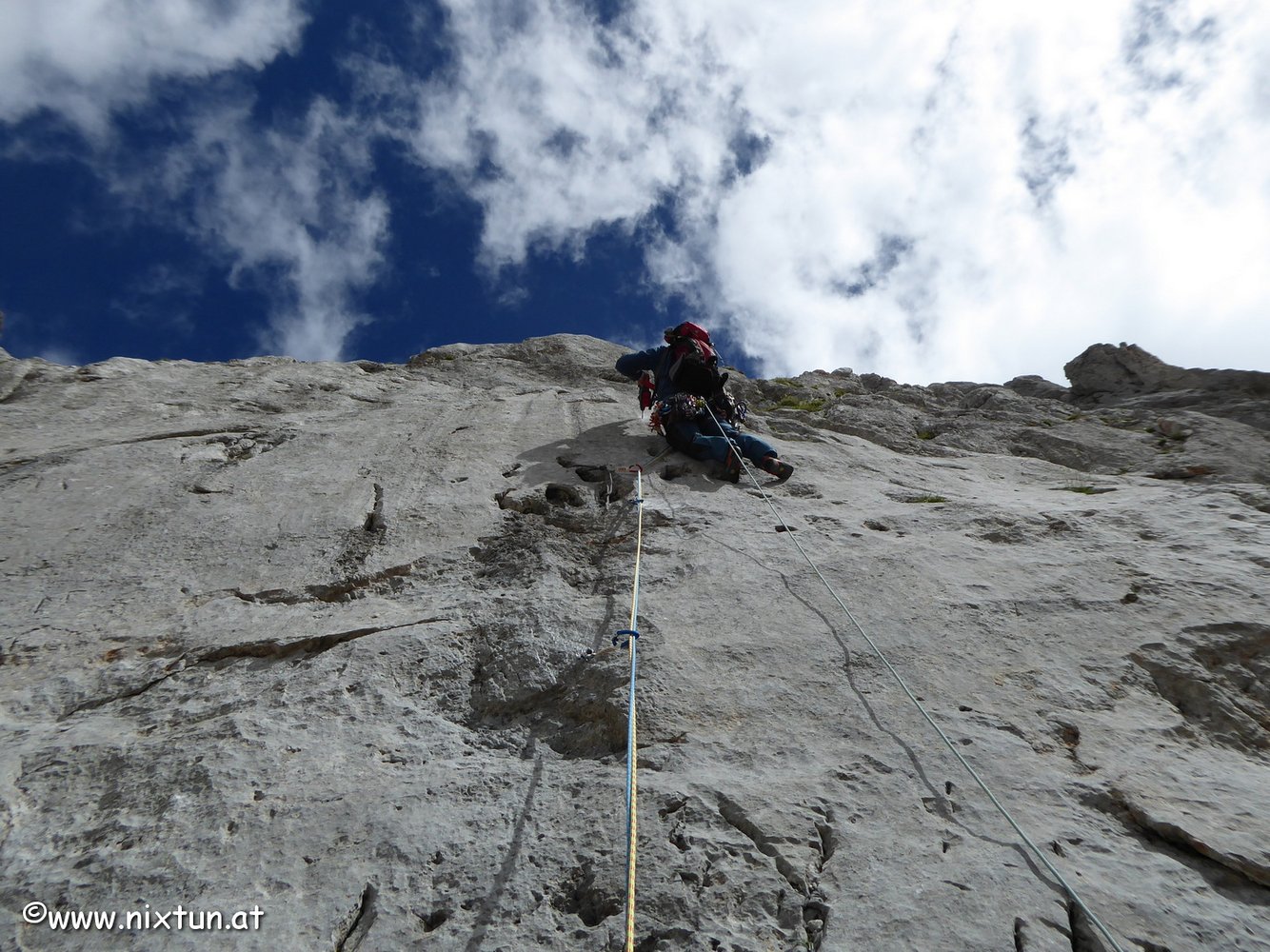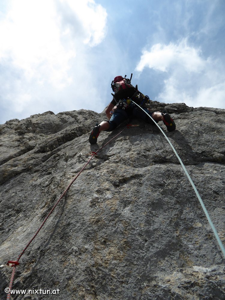Anspruchsvolle Tour durch den zentralen Teil des vom Stangenkar gut sichtbaren markanten Pfeilers. Die Tour besitzt bis auf die fünfte Seillänge und die Passage am Grat durchwegs festen, teilweise sogar traumhaften Fels.