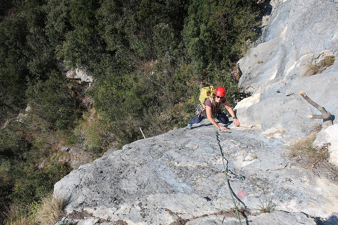 In der zweiten Seillänge - der leicht abfallenden Querung - ist es ganz egal, ob man im Vor- oder im Nachstieg klettert (Bohrhaken stecken mehr als genug).