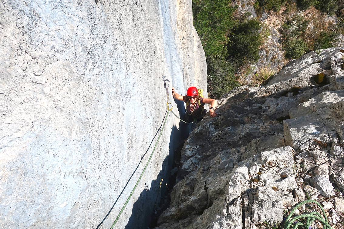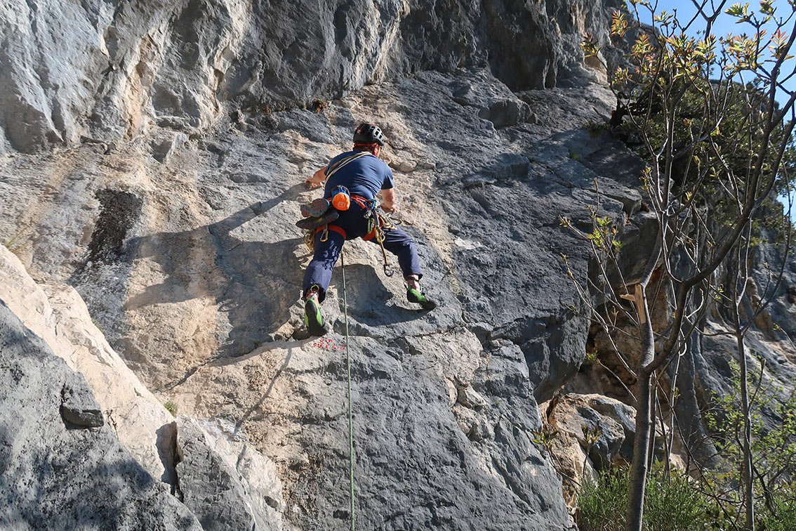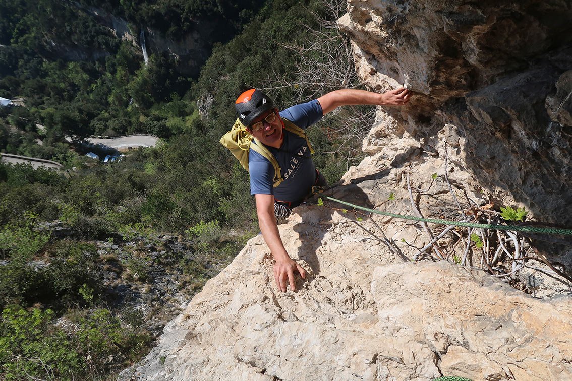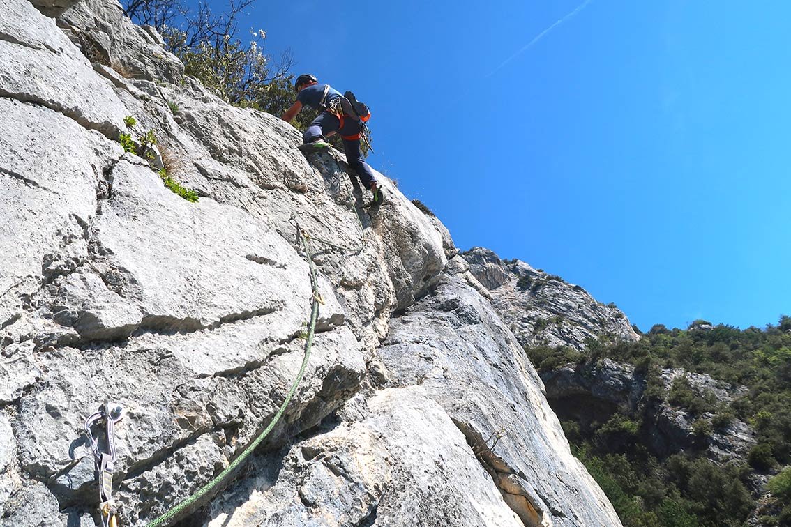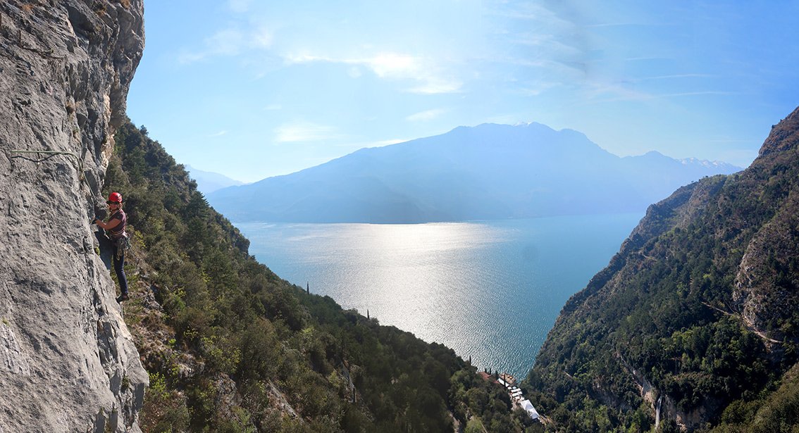 Die Plaisirroute Su e Giu zeichnet sich vor allem durch perfekt abgesicherte Querungen aus. Die Absicherung mit Bohrhaken ist quasi super plaisir, da fällt die brüchige Seillänge im Mittelteil auch nicht so ins Gewicht. Der Anstieg ist eine gelungene Ergänzung zu den anderen Plaisirrouten an der Wand, wegen der südöstlichen Ausrichtung sind viele Sonnenstunden und schöner Seeblick garantiert!