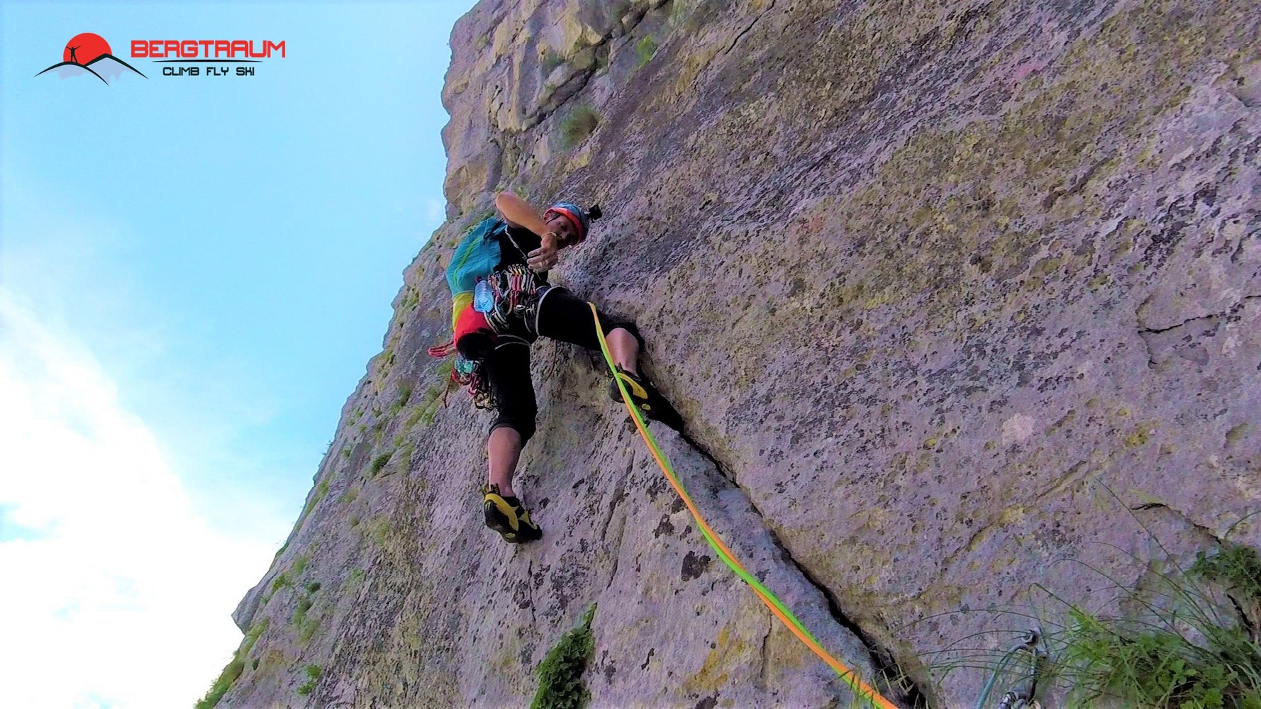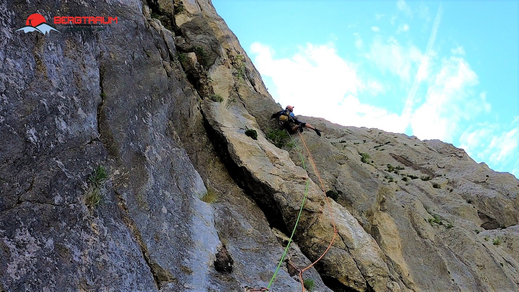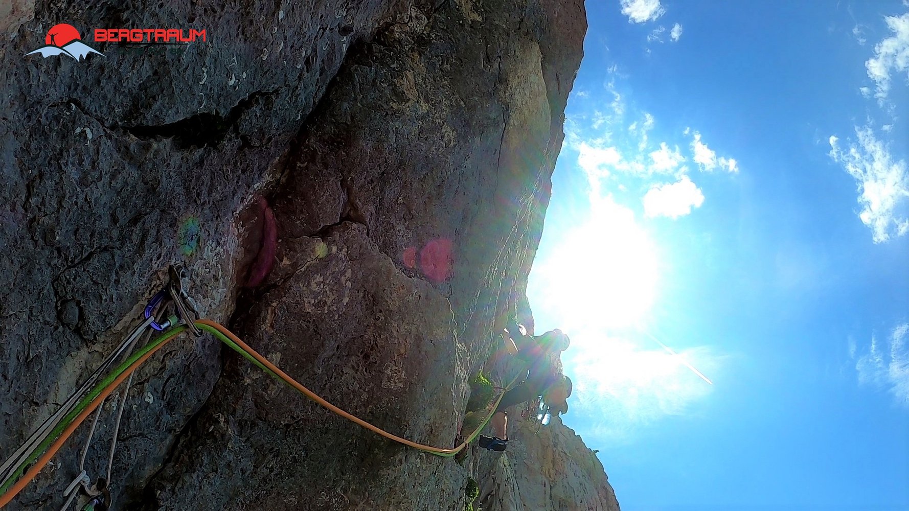 Die ersten beiden Seillängen moderat entlang der markanten Rampe rauf (4a). Dann in einem Rechts- Linksbogen weiter und schräg links (immer links der Zenit und der Klin) aufwärts unter das markante Riesendach. Querung nach links unter dem Dach entlang (6c+). Einen leicht überhängenden Piazriss in gerader Linie hinauf (5c und 6a). Die lange Abschlusslänge geht über megaschöne Wasserrillen gerade rauf zum Ausstieg (55 m, 4b).