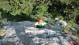Vom Parkplatz der gelben Markierung Richtung Leiterlsteig folgen und 10 m vor der Wand (Versicherungen) links auf Steigspur 30 m Einstieg queren (Einstiegsaufschrift).