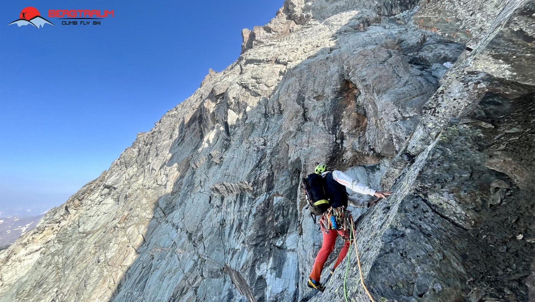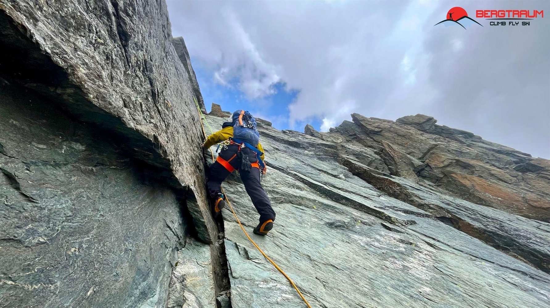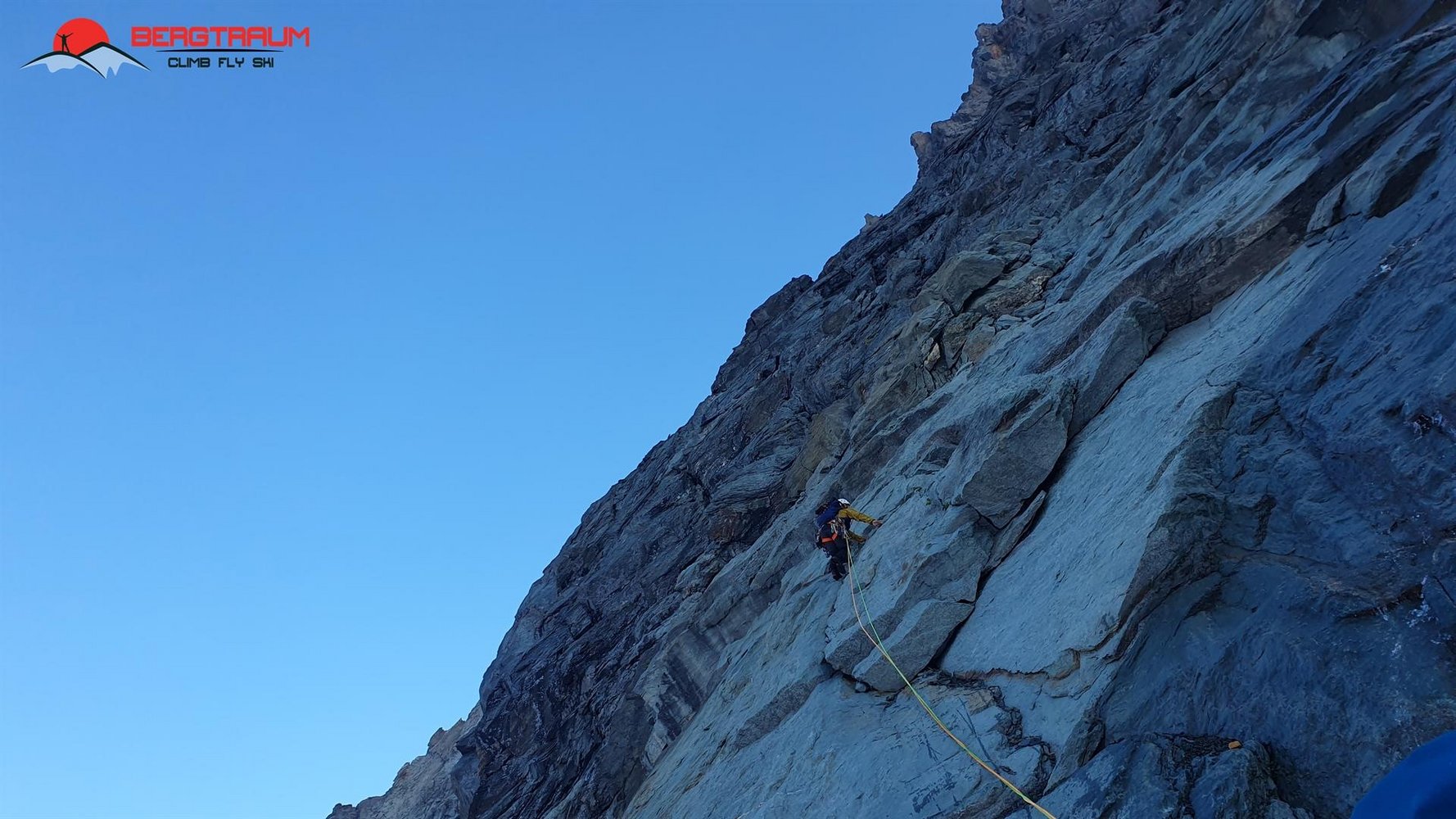 Die erste Seillänge steil hinauf in das plattige, flachere Gelände (Doppelriss- oft wasserüberronnen, dann rechts im Fels). Lange Linksquerung aufwärts bis zum Grat. In weiterer Folge immer der Spürnase nach den Weg des geringsten Wiederstandes klettern. Einige Seillängen in der Schattseite (Westseite des Grates) steil durch Verschneidungen rauf. Im Mittelteil wieder sonnseitig rechtshaltend ansteigen, bis man nach einer senkrechten, herrlichen Verschneidung und einer anschließenden flachen Querung zur Scharte des Südwandwächters kommt (ca. 3.600 m). Nun markant nach links ( Richtung Stüdlgrat) 20 Meter waagrecht queren. Dann über megaschöne Verschneidungen zwei Seillängen (Anfangs ein Piaz- Handriss) in flacheres Gelände. Nun wiederum in zwei langen Seillängen linksaufwärts zum Ausstieg am Stüdlgrat (ca. 3.700 m). Über diesen zum Gipfel auf 3.798 m hinauf.