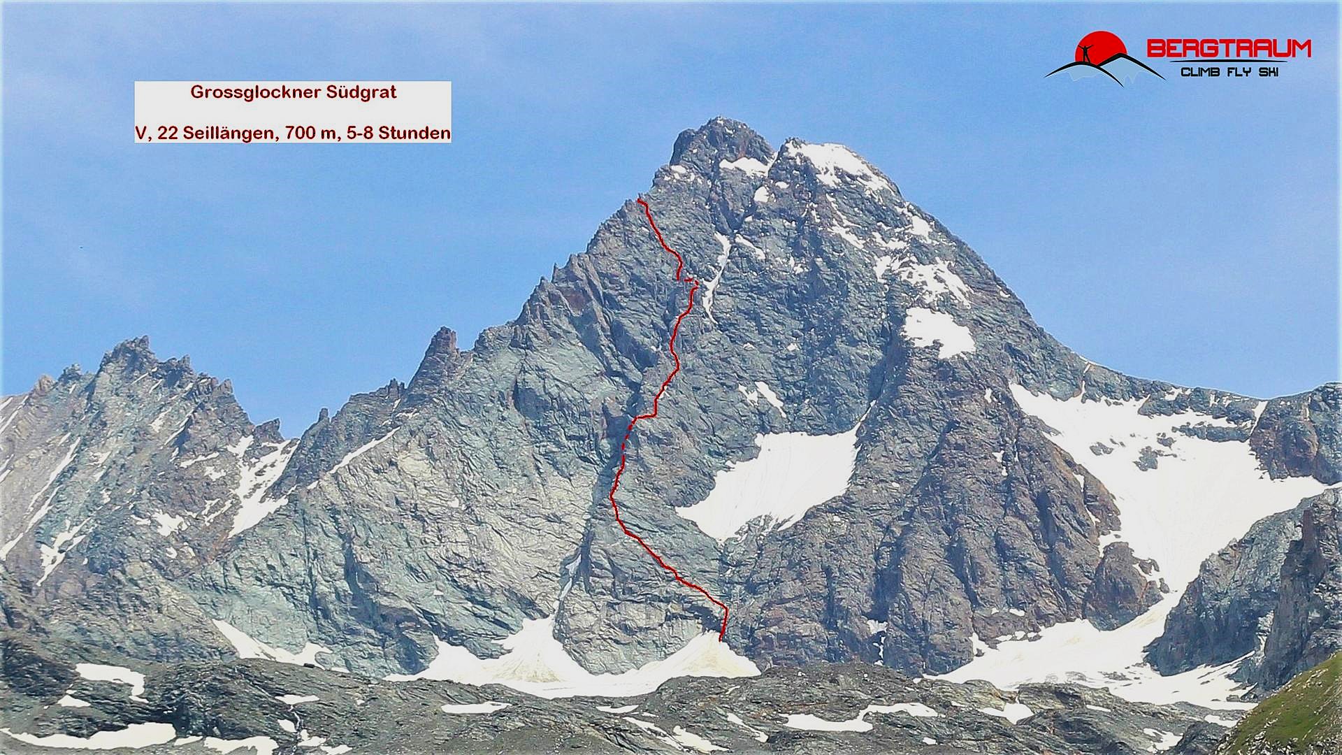 Eine imposante, sehr klassische Linie am höchsten Berg Österreichs. Die Tour führt im Wesentlichen immer entlang des Südgrates durch den Zentralteil der Südwand hinauf. Im oberen Drittel quert man den Südwandwächter und folgt dem Grat weiter bis zur Einmündung am Stüdlgrat. Herrliche, eindrückliche Kletterei am wohl einsamsten Anstieg auf das Dach Österreichs.